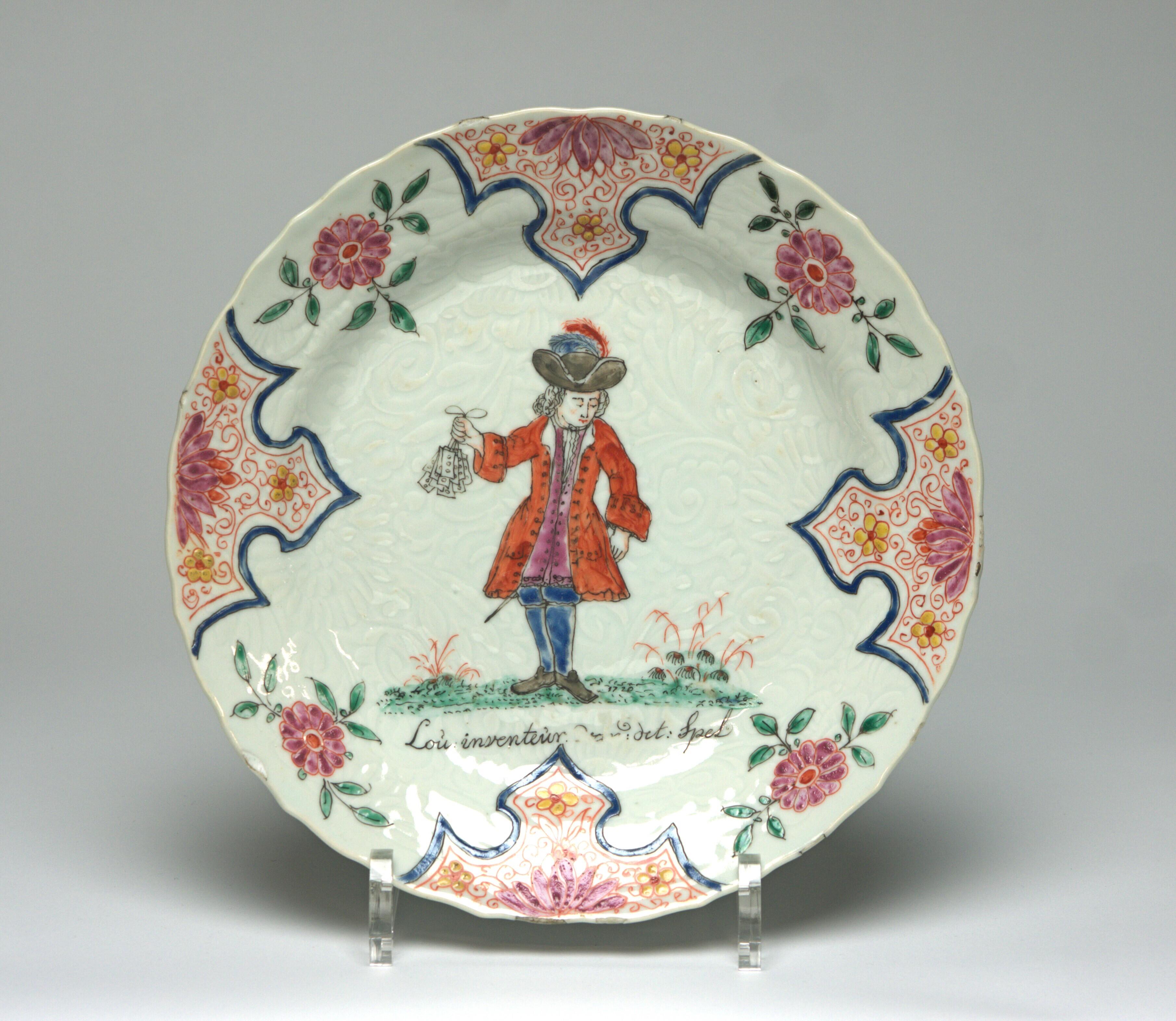rond, gegolfde rand, standring, licht reliëfpatroon van bloemen en ranken onder het glazuur, op de rand vier evenredig verdeelde wolkenmotieven, afgewisseld met floraal ornament, op het plat een staande man met gepluimde steek, halflange rode jas en blauwe kousen, in zijn rechterhand houdt hij een bundel aandelen, onderschrift: "Lou:inventeur:van:dit:spel" ("Lou" = John Law, de bedenker van de actiehandel) De afbeeldingen op de Actiebordjes behoren tot de bekendste historische taferelen. Als gevolg van de speculatie met aandelen (acties) van zwendelmaatschappijen, werd in eerste instantie veel geld verdiend. Door de economische crisis in 1720 stortte de markt in waardoor velen tot armoede vervielen. Deze gebeurtenis werd tot onderwerp van veel spotprenten en schotschriften waarvan het bekendste is 'Het Groote Tafereel der Dwaasheid' uit 1720. (Nederlands)