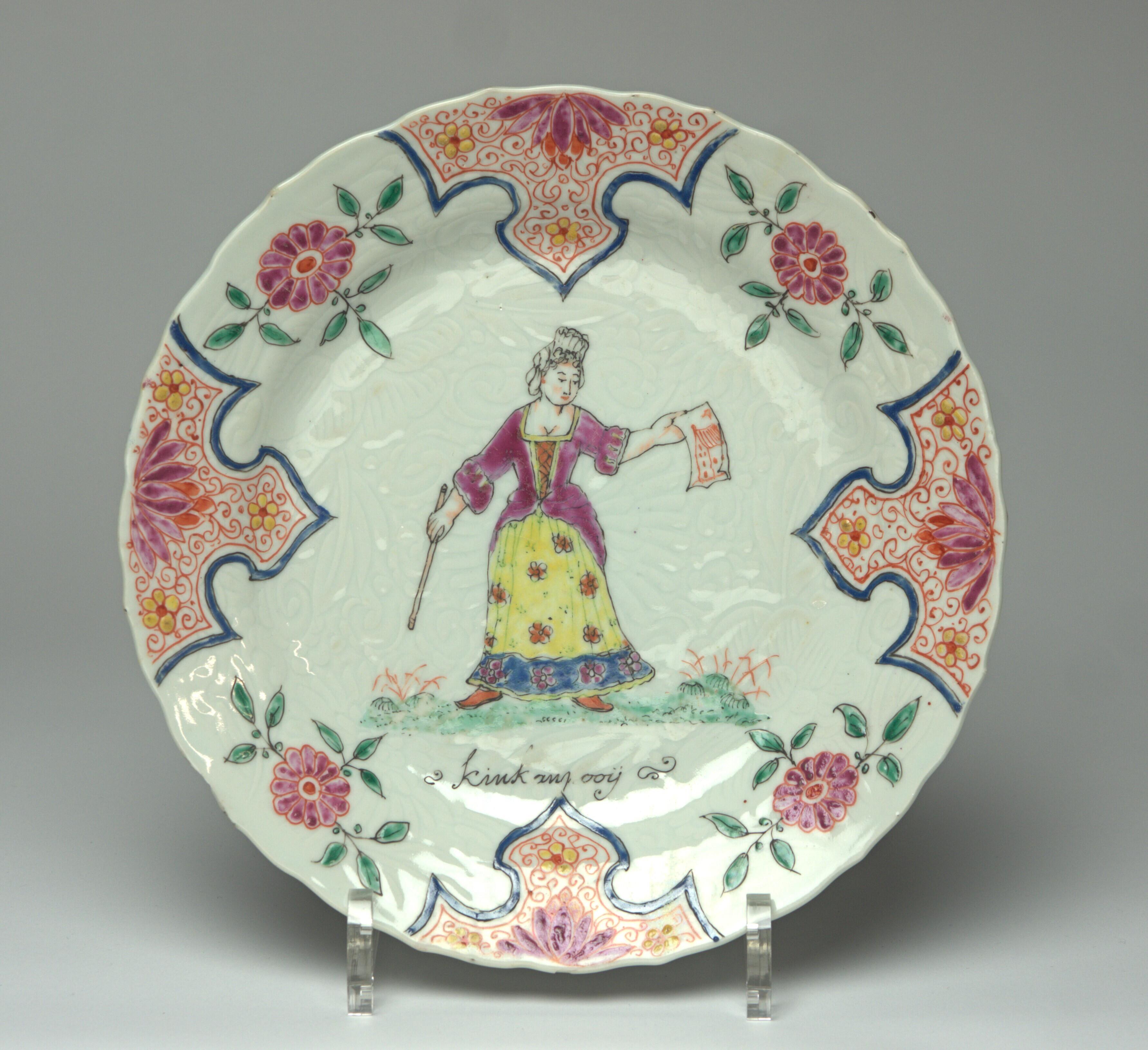 rond, gegolfde rand, standring, licht reliëfpatroon van bloemen en ranken onder het glazuur, op de rand vier evenredig verdeelde wolkenmotieven, afgewisseld met floraal ornament, op het plat een staande dame met fontange en gebloemde gele rok, in haar rechterhand houdt zij een stok, in haar linkerhand een aandeel waarop een huis is getekend, onderschrift: "Kinkanprooij" (= Quincampoix, de straat in Parijs waar John Law zijn kantoor had gevestigd) Vanwege de speculatiehandel moet de dame haar huis verkopen. De afbeeldingen op de Actiebordjes behoren tot de bekendste historische taferelen. Als gevolg van de speculatie met aandelen (acties) van zwendelmaatschappijen, werd in eerste instantie veel geld verdiend. Door de economische crisis in 1720 stortte de markt in waardoor velen tot armoede vervielen. Deze gebeurtenis werd tot onderwerp van veel spotprenten en schotschriften waarvan het bekendste is 'Het Groote Tafereel der Dwaasheid' uit 1720. (Nederlands)