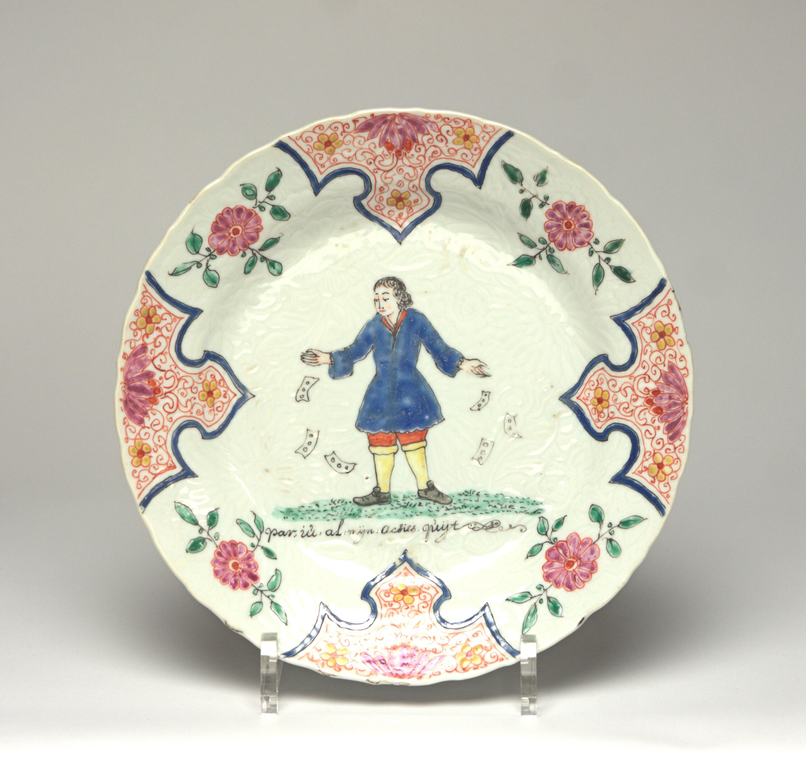 rond, gegolfde rand, standring, licht reliëfpatroon van bloemen en ranken onder het glazuur, op de rand vier evenredig verdeelde wolkenmotieven, afgewisseld met floraal ornament, op het plat een staande man met halflange blauwe jas en gele kousen, uit beide handen vallen aandelen, onderschrift: "par:iu:al:mijn:acsies:...uijt" De afbeeldingen op de Actiebordjes behoren tot de bekendste historische taferelen. Als gevolg van de speculatie met aandelen (acties) van zwendelmaatschappijen, werd in eerste instantie veel geld verdiend. Door de economische crisis in 1720 stortte de markt in waardoor velen tot armoede vervielen. Deze gebeurtenis werd tot onderwerp van veel spotprenten en schotschriften waarvan het bekendste is 'Het Groote Tafereel der Dwaasheid' uit 1720. (Nederlands)