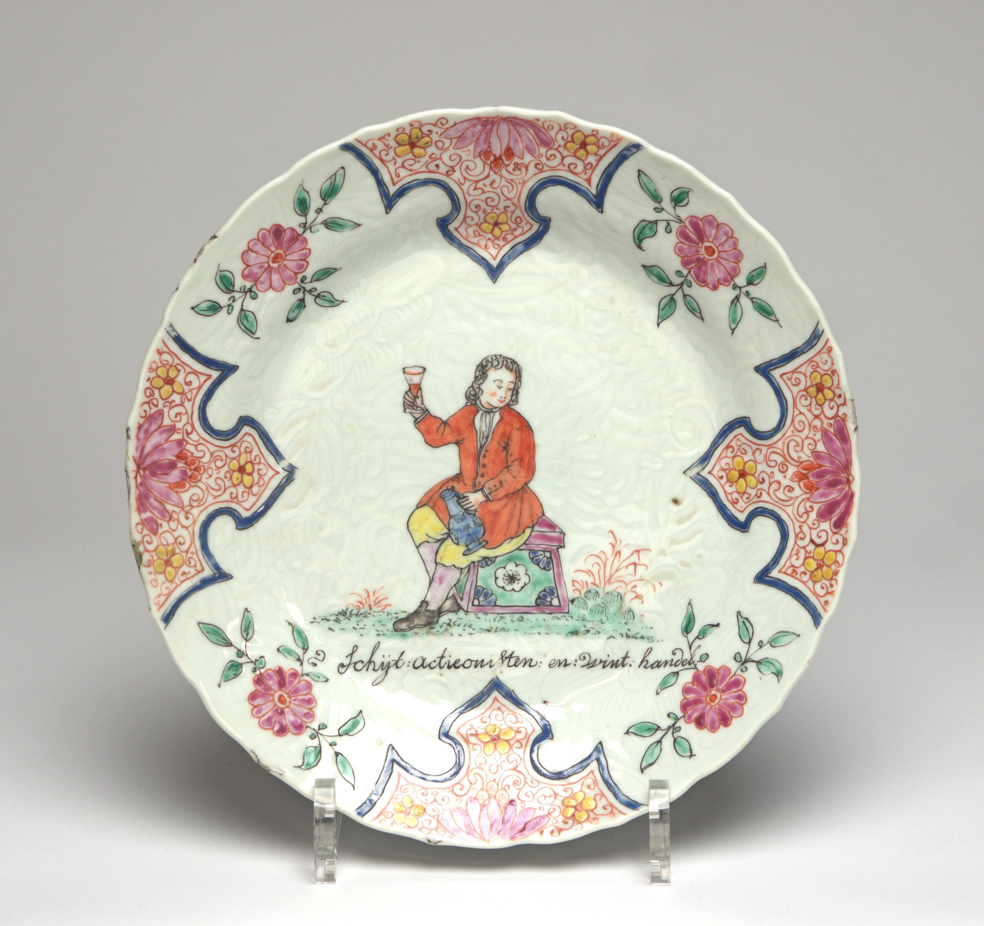 rond, gegolfde rand, standring, licht reliëfpatroon van bloemen en ranken onder het glazuur, op de rand vier evenredig verdeelde wolkenmotieven, afgewisseld met floraal ornament, op het plat op een geornamenteerde stenen bank zittende man met halflange roodbruine jas en gele pofbroek, hij heft met rechterhand een glas, in de linker houdt hij een wijnkaraf, onderschrift: "schijt:actieonisten:en:wint:handel". Op aandeelhouder die zich aan de speculatie verrijkt heeft De afbeeldingen op de Actiebordjes behoren tot de bekendste historische taferelen. Als gevolg van de speculatie met aandelen (acties) van zwendelmaatschappijen, werd in eerste instantie veel geld verdiend. Door de economische crisis in 1720 stortte de markt in waardoor velen tot armoede vervielen. Deze gebeurtenis werd tot onderwerp van veel spotprenten en schotschriften waarvan het bekendste is 'Het Groote Tafereel der Dwaasheid' uit 1720. (Nederlands)
