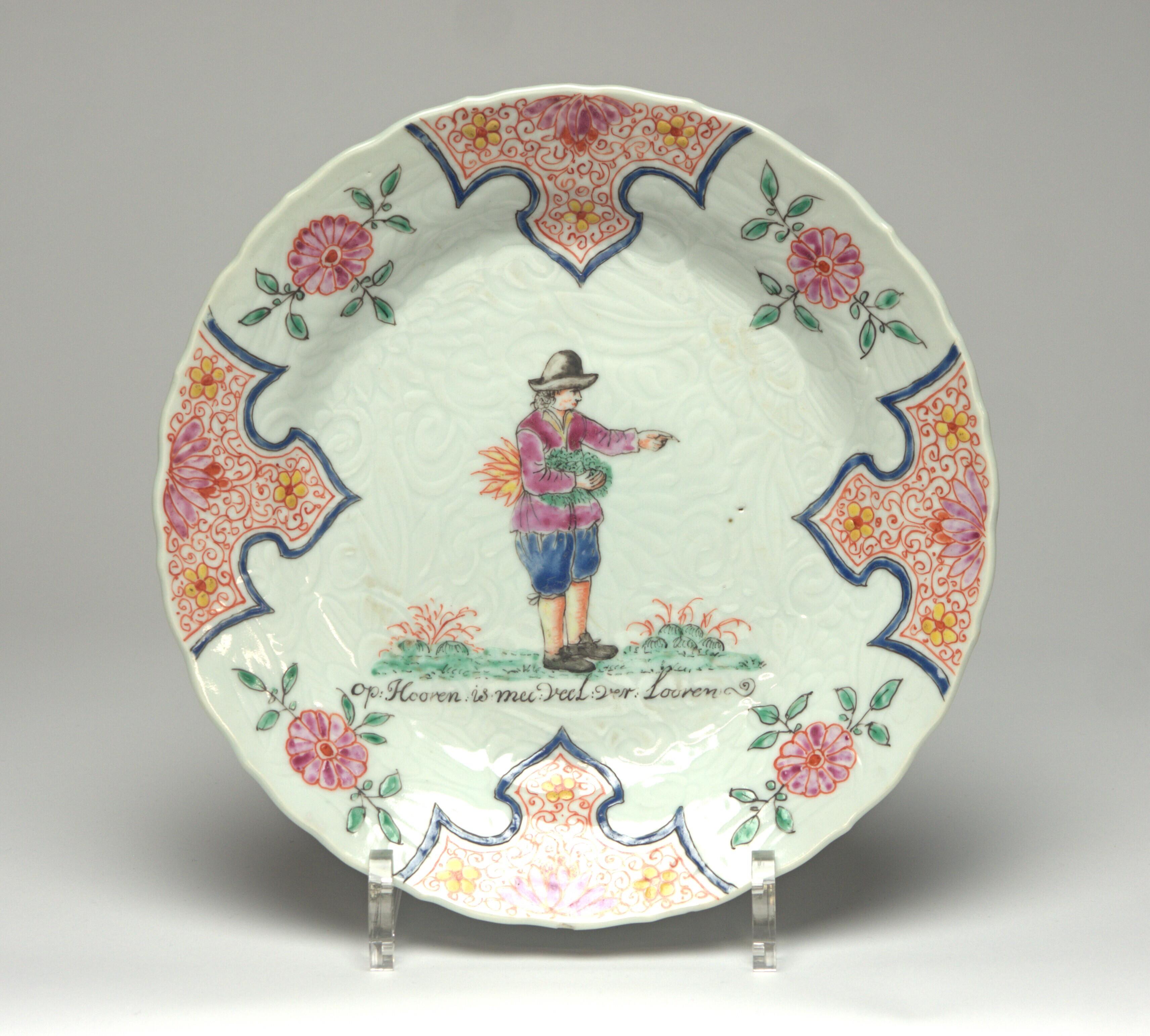 rond, gegolfde rand, standring, licht reliëfpatroon van bloemen en ranken onder het glazuur, op de rand vier evenredig verdeelde wolkenmotieven, afgewisseld met floraal ornament, op het plat een staande naar rechts gewende man, hij wijst met zijn rechterarm, hij draagt een rood jak op een blauwe kniebroek, draagt gele kousen en een zwarte hoed, onder zijn arm houdt hij tabaksbladeren, onderschrift: "op Hooren is mei veel ver Looren" De afbeeldingen op de Actiebordjes behoren tot de bekendste historische taferelen. Als gevolg van de speculatie met aandelen (acties) van zwendelmaatschappijen, werd in eerste instantie veel geld verdiend. Door de economische crisis in 1720 stortte de markt in waardoor velen tot armoede vervielen. Deze gebeurtenis werd tot onderwerp van veel spotprenten en schotschriften waarvan het bekendste is 'Het Groote Tafereel der Dwaasheid' uit 1720. (Nederlands)