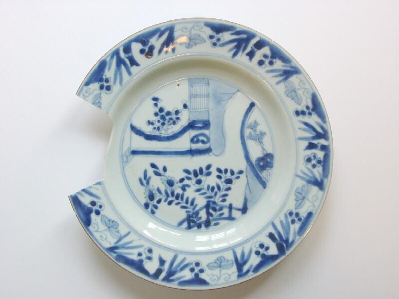spiegel: tuin met bloemen en zuil; vlag: alternerend patroon van plant- en bloemmotieven; bruine rand langs vlag recht uitstaande rand, knik op spiegel uitgeschraapte standring (Nederlands)