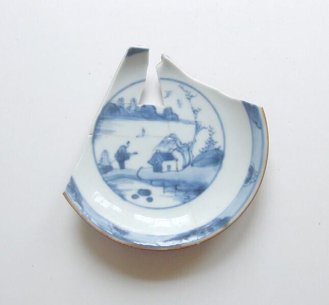 spiegel: Chinees landschap (huis bij meer); smalle blauwe rand langs vlag; vlag uitwendig bruin, capucijner goed standring, uitgebogen rand, vloeiend naar spiegel (Nederlands)