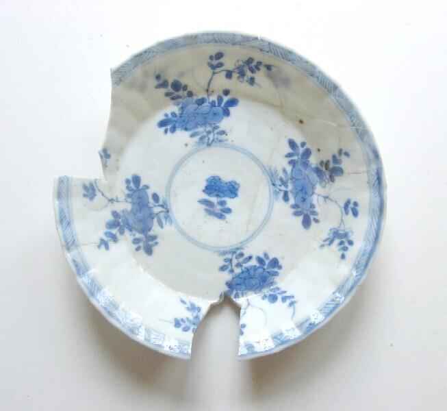 bloem- en bladmotieven; midden spiegel: bloem in cirkel; smalle gearceerde rand; ext. vlag: tak met bloem (2x); ext. spiegel: (Chinees) merkteken in cirkel putjes in glazuur, standring uitgebogen rand, gekarteld, zeer hoge kwaliteit veldspaatglazuur (Nederlands)