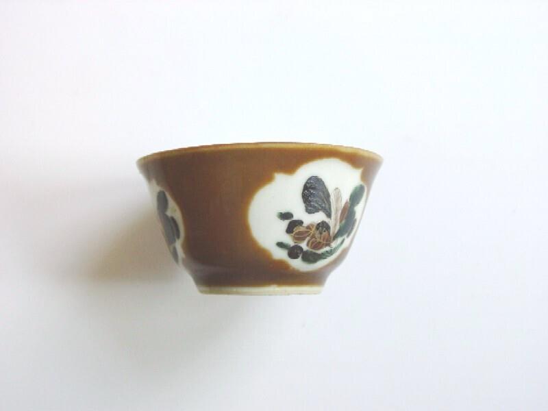 capucijner goed, bruin, groen, zwart, goud op wit; ext.: in (wit) uitgespaarde cartouches tegen bruin fond: bladmotief in onderglazuur groen en bovenglazuur goud en zwart; int.; bodem: bladmotief (als hierboven omschreven) standring uitgebogen randlip (Nederlands)
