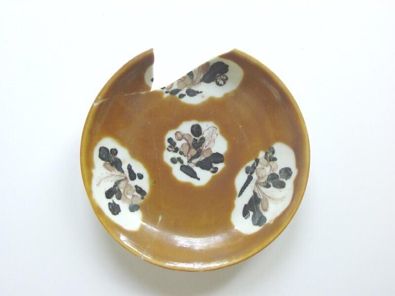 capucijner goed, in wit opengelaten cartouches tegen bruin fond: bladmotief in onderglazuur bruin en bovenglazuur zwart en goud standring uitgebogen rand, vloeiend naar spiegel (Nederlands)