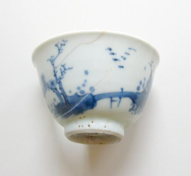 ext.: Chinees landschap; int., bodem: stippen (verfdruppels?); dubbele lijn langs bovenrand Kangxi-periode? standring, uitgebogen randlip (Nederlands)