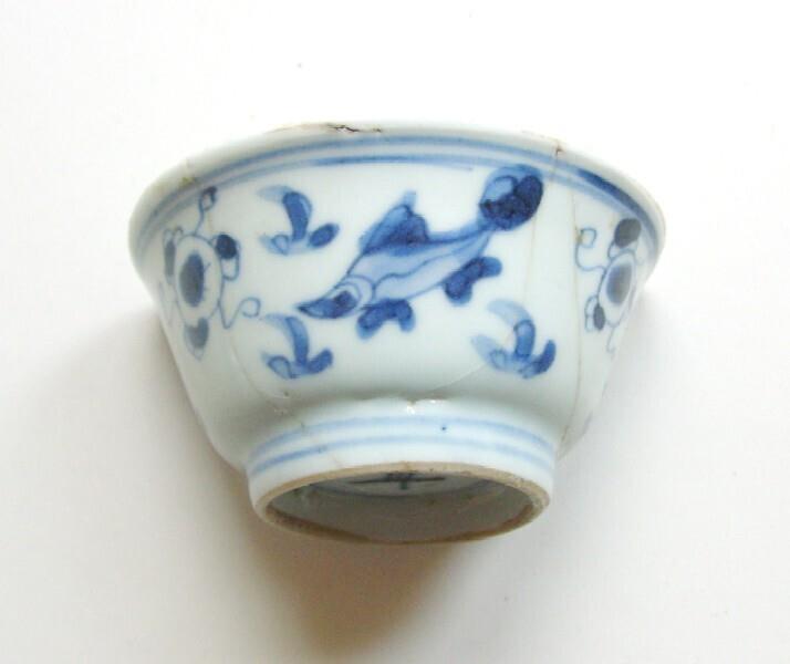 ext.: alternerend vissen en zeewezens (kwallen?); int., bodem: krab binnen dubbele cirkel; langs bovenrand: dubbele lijn merkteken op bodem (ext.): Chinees (fantasie-?)karakter (wierookbrander?) (hoge) standring uitgebogen randlip (Nederlands)