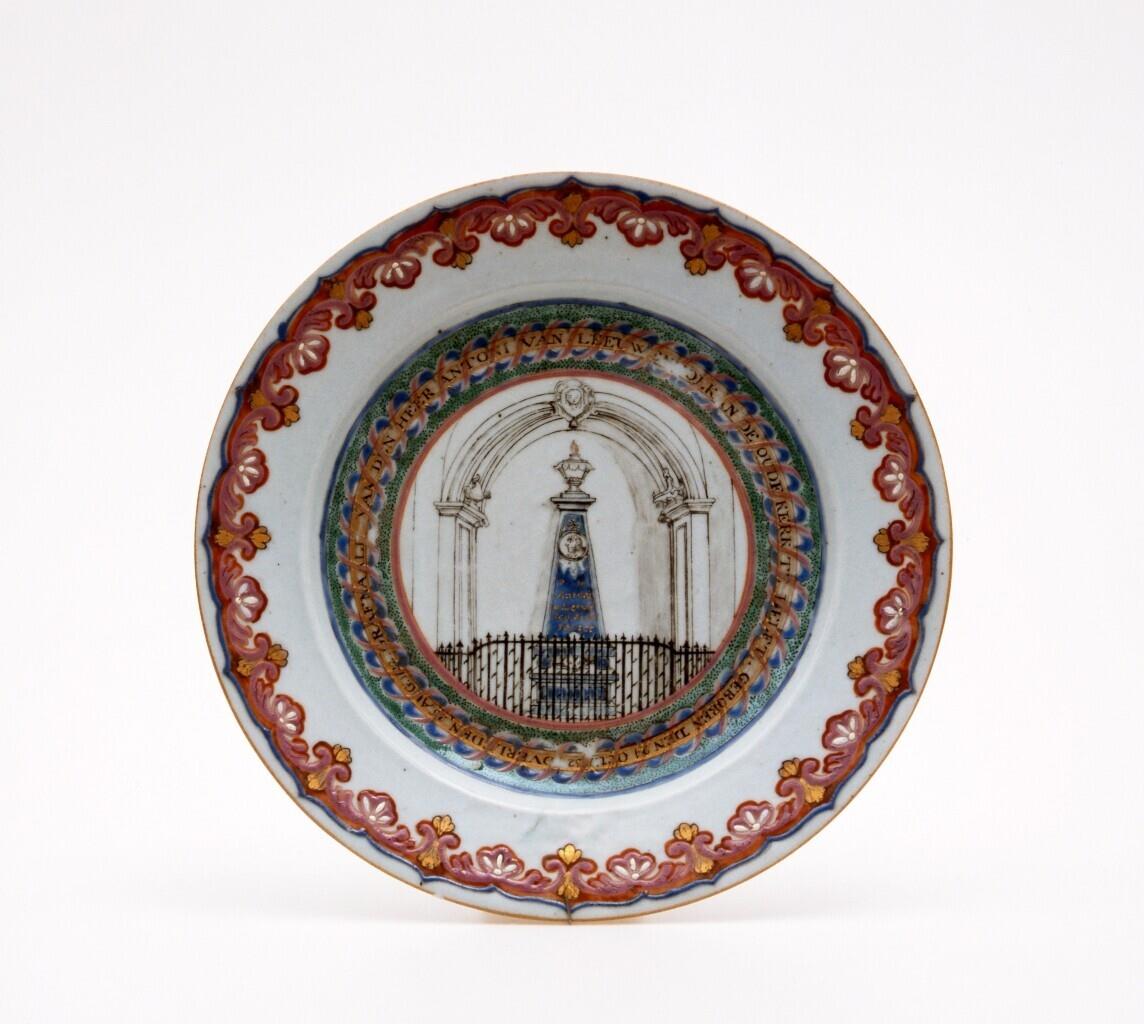 Bord met op het plat het grafmonument van Anthoni van Leeuwenhoek, omsloten door een kabelrand in blauw, groen en geel met een ononderbroken roze spiraalslinger waarin de tekst 'Grafnaalt van den heer Antoni van Leeuwenhoek in de Oude Kerk te Delft. Geboren den 24 oct: 1632 overleden 26 aug: 1722'. (d.m.z. 1723) De platte rand draagt als versiering een accolade-vormige band met naar binnen gerichte fleur-de-lis motieven, afgewisseld door gestileerde bloemen. (Nederlands)