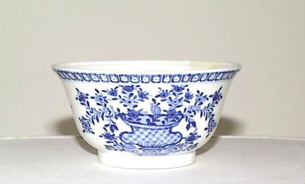 De kom is omgekeerd klokvormig en heeft een standring. De buitenwand is gedecoreerd met twee geruite potten met bloeiende planten. Langs de rand loopt een band met servetwerk. (Nederlands)