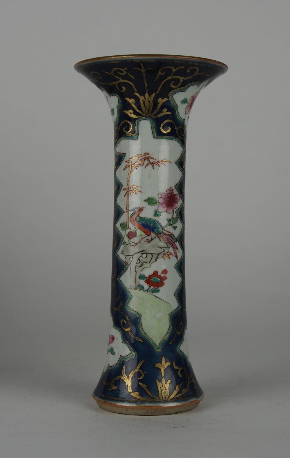 De bekervazen zijn concaaf-cilindervormig en hebben een standring. De gedekselde vazen zijn balustervormig met een concaaf-conische voet op een standring en hebben een licht conische hals en een wijd klokvormig deksel met een radijsvormige knop. De zogenoemde 'powder blue' vazen hebben een decor van rank- en strikwerk in bovenglazuur goud; vaas A (links op de foto's) heeft een 'prunus on cracked ice'-decor in bovenglazuur goud. De vazen hebben twee in het blauw uitgespaarde grote bladvormige cartouches waarin een bloeiende plant met een vogel, en vier kleine bloemvormige cartouches met een bloem. De deksels zijn gedecoreerd met drie kleine bloemvormige cartouches met een bloem. Twee deksels hebben een 'prunus on cracked ice'-decor in bovenglazuur goud; een deksel heeft rankwerk in bovenglazuur goud. (Nederlands)