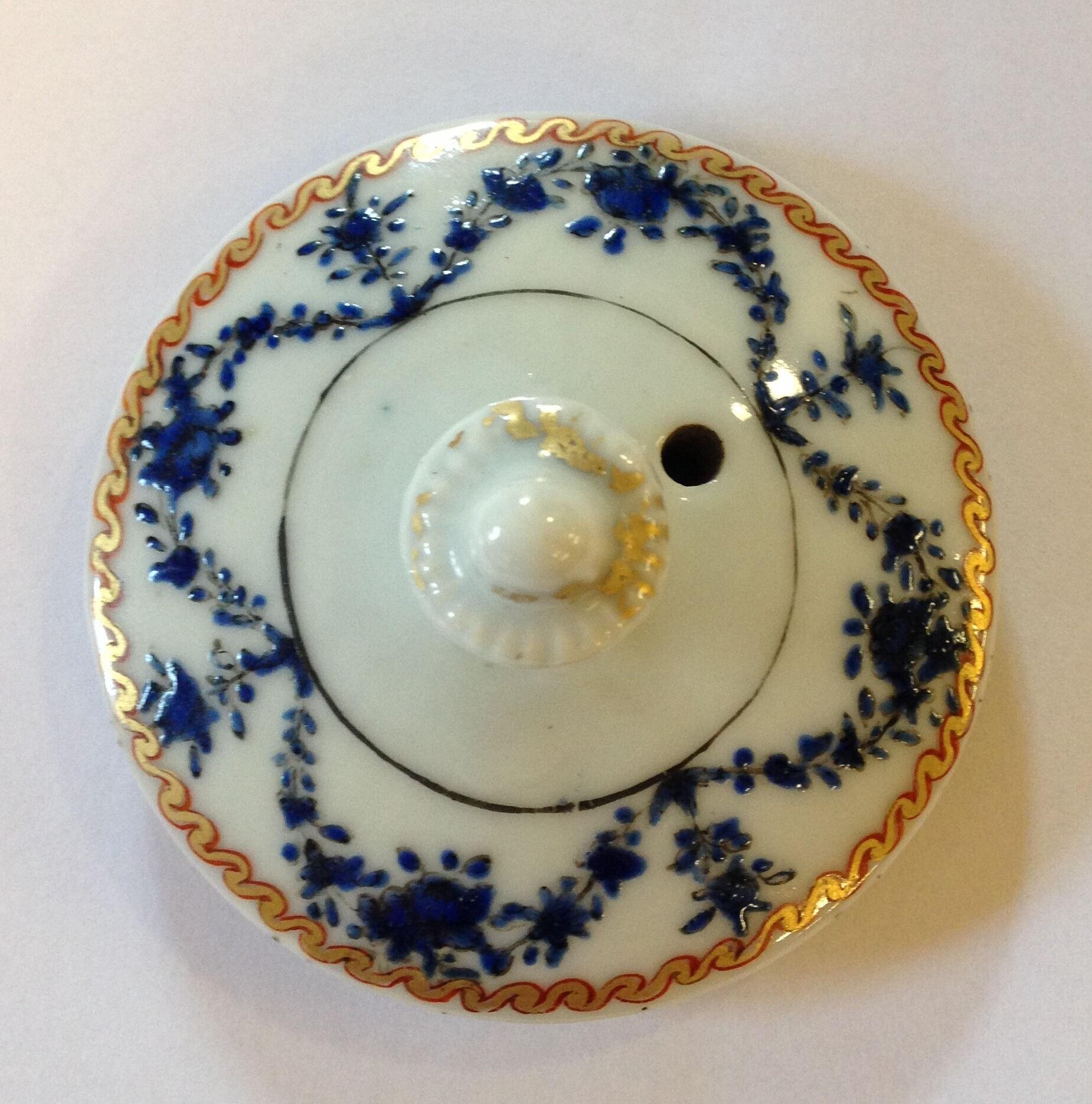 Deksel met ronde knop waarschijnlijk afkomstig van een theepot, waarop het wapen van de familie van Alderwerelt staat. Op de bovenrand is een golvend ketting motief in rood en goud met daaronder festoenen in bovenglazuur blauw. (Nederlands)