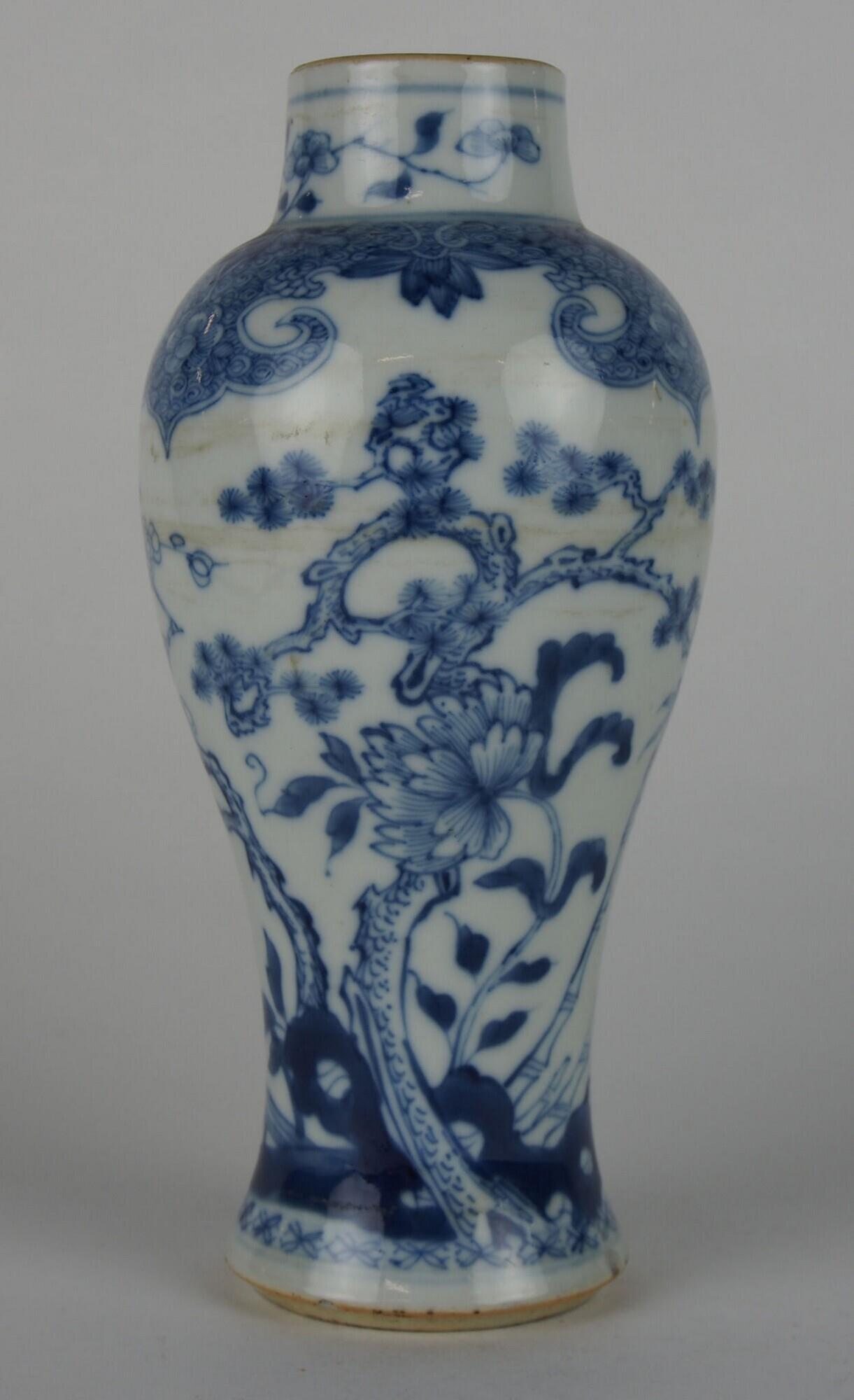 De vazen zijn balustervormig en hebben een standring en een licht conische hals. Op de voet loopt een band met swastikavormig servetwerk. De buik is gedecoreerd met een landschap met rotsen, een hekje met swastikamotief, alsmede pijnboom, prunus en bamboe, de zogenoemde 'drie vrienden van de winter'. Op de schouder bevindt zich een grillig gevormde band met bloemvormig servetwerk. De hals heeft een decor van bloesemtakken. (Nederlands)