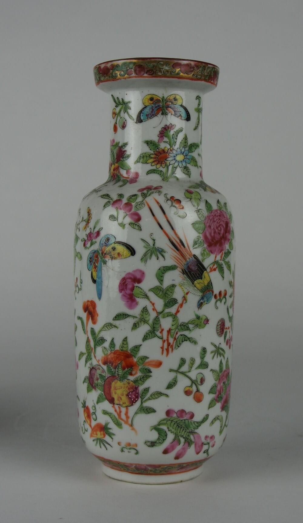 De cilindrische vazen hebben een omgekeerd convex-conische bodem op een hoge standring, een convex-conische schouder, en een omgekeerd concaaf-conische hals met een opstaande monding. Op de standring en langs de rand lopen banden met floraalmotieven. De buik en de hals zijn gedecoreerd met bloesemtakken, vruchten, peulen, bladeren, vogels en vlinders. (Nederlands)