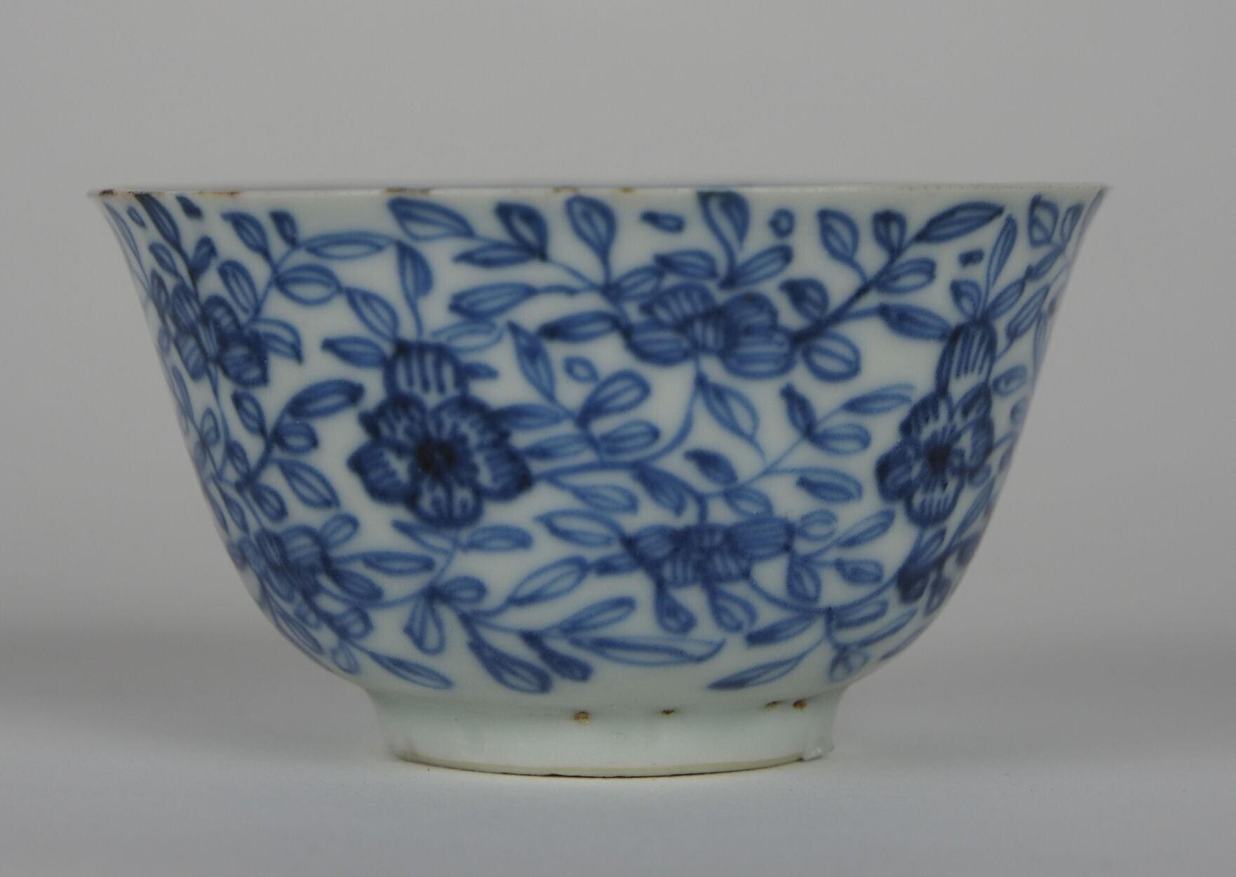 De kommen zijn omgekeerd klokvormig en hebben een standring. Het plat heeft een decor van een bloem. Langs de binnenrand loopt een band met bladranken. De buitenwand is gedecoreerd met bloesemtakken.Schade aan de rand (Nederlands)