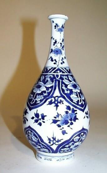 De vaas is druppelvormig en heeft een verdikte monding en een licht conische voet. Dit type vaas wordt wel aangeduid met flesvaas. De buik heeft een decor van bloem- en bladmotieven, waaronder en -boven zich bladvormige cartouches met bloemenranken bevinden. Tussen de cartouches bevindt zich gestileerd rankwerk. Onderaan de hals loopt een band met driehoekig servetwerk met halve bloempjes. De hals zelf is gedecoreerd met bloemenranken. Op de voet loopt een band met gestileerd rankwerk. (Nederlands)