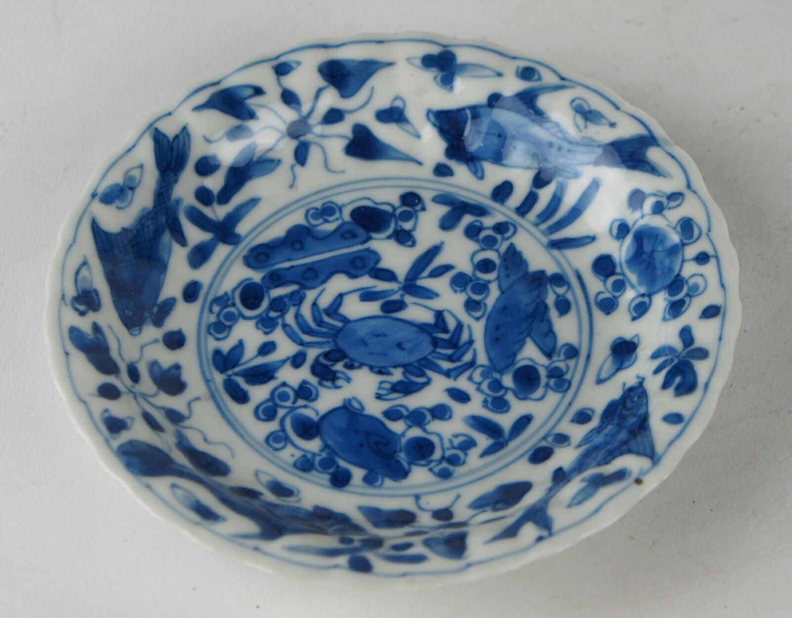 De gecontourneerde schotel heeft een standring en een geschulpte rand. De gecontourneerde theekom is omgekeerd wijd klokvormig en heeft een standring en een licht geschulpte rand. De schotel heeft, binnen een dubbele cirkel, een decor van een krab, schelpen en vermoedelijk kikkerdril tussen waterplanten. De wand is gedecoreerd met karpers tussen bloemen. De buitenwand heeft een decor van boeddhistische symbolen. De kom heeft, binnen een dubbele cirkel, een decor van een krab. Langs de rand loopt een band met servetwerk. De buitenwand is, boven een band met golven, gedecoreerd met karpers tussen bloemen. (Nederlands)