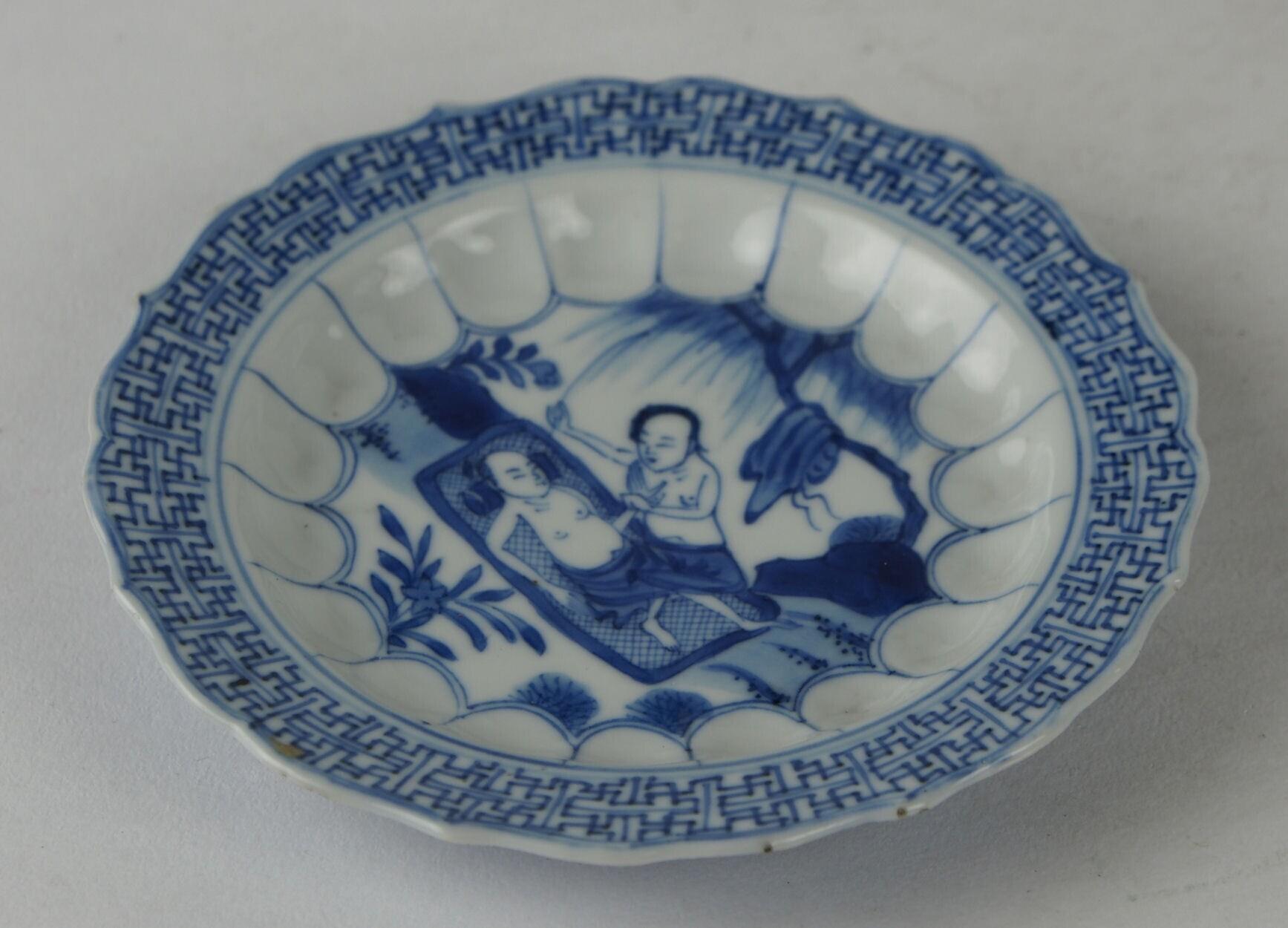 De schotel heeft een gecontourneerde wand, een schuin oplopende, geaccoleerde rand een standring. De theekom is omgekeerd wijd klokvormig en heeft een gecontourneerde wand, een licht geschulpte rand en een standring. De schotel en het plat van de kom hebben een erotisch decor van een landschap met bloeiende planten, een treurwilg warover een kledingstuk hangt, en een deels ontkleed oosters paar waarvan de man op een kleedje ligt. Deze scène staat wel bekend als 'de acupuncturist'. Het schoteltje heeft rond de centrale voorstelling een rand met nagelvormige vakken. Langs de binnenranden van de schoteltje en de kom lopen banden met swastikavormig servetwerk. De buitenwand van de schotel heeft boven de standring een band met vakken met floraalmotieven, waarboven een band met bloemenranken. De buitenwand van de kom heeft boven de standring een band met ronde cartouches waarin bloemen, waarboven zich een band met landschapsdecors bevindt. Langs de rand loopt een band met floraalmotieven. (Nederlands)