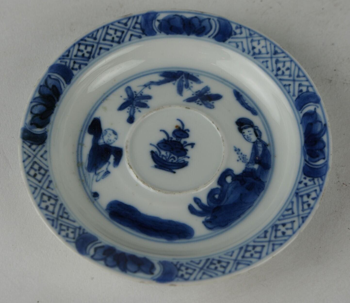 Het schoteltje heeft een standring, een licht oplopende rand en een stuitrandje op het plat. Het kommetje is licht concaaf-conisch van vorm en heeft een standring. Het schoteltje heeft op het plat een centraal floraalmotief met daaromheen een decor van bloesemtakken, een spelend zotje en een oosterse dame, een zogenoemde 'lange Lijs', gezeten op een rots. Langs de rand loopt een band met swastikavormig servetwerk. De buitenwand heeft een decor van boeddhistische symbolen. Het kommetje heeft op het plat, binnen een dubbele cirkel, een decor van een rots met gras. Langs de rand loopt een band met swastikavormig servetwerk. De buitenwand is gedecoreerd met een treurwilg, een zotje en een lange Lijs. (Nederlands)