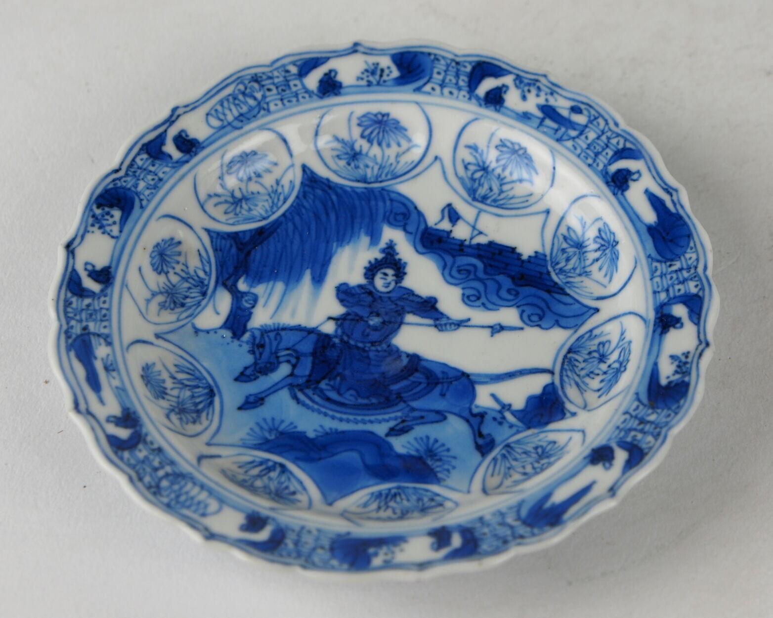 Het schoteltje heeft een standring en een schuin oplopende, gecontourneerde en geaccoleerde rand. Het afwijkende schoteltje is gewelfd en licht gecontourneerd, en heeft een standring en een licht geaccoleerde rand. De kommetjes zijn omgekeerd concaaf-conisch van vorm en hebben een standring, een gecontourneerde wand en een geaccoleerde rand. Het schoteltje en het plat van de kommen hebben decors van een landschap met gestileerde wolken, een vesting met een vaandel, een treurwilg en een gewapende krijger te paard. Het schoteltje heeft, rond het centrale decor, ronde cartouches met chrysanten. Langs de binnenranden van het schoteltje en de kommen lopen banden met cartouches waarin een landschap met een zittende oosterse figuur. De buitenwand van het schoteltje heeft boven de standring ovale cartouches en daarboven rechte kaders waarin floraal- en landschapsdecors. De buitenwand van de kommen heeft boven de standring bloembladvormige cartouches waarin afwisselend een krijger te paard en een landschapsdecor. Langs de buitenrand van de kommen loopt een band met vakken waarin floraaldecors. Het afwijkende schoteltje heeft een centraal decor van draken, een band met bloemblaadjes waari... (Nederlands)