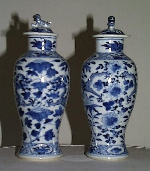 De dekselvazen zijn balustervormig en hebben een standring en een rechte hals. De gewelfde deksels hebben een brede, verdikte rand en een knop in de vorm van een boeddhistische leeuw. De voeten en schouders zijn gedecoreerd met een band met swastikavormig servetwerk waartussen vier afwisselend geschulpte en waaiervormige cartouches met bloemen. De buiken hebben decors van bloeiende planten en twee vierklauwige draken. De halzen hebben decors van bloeiende perzik. De deksels zijn gedecoreerd met floraalmotieven. (Nederlands)