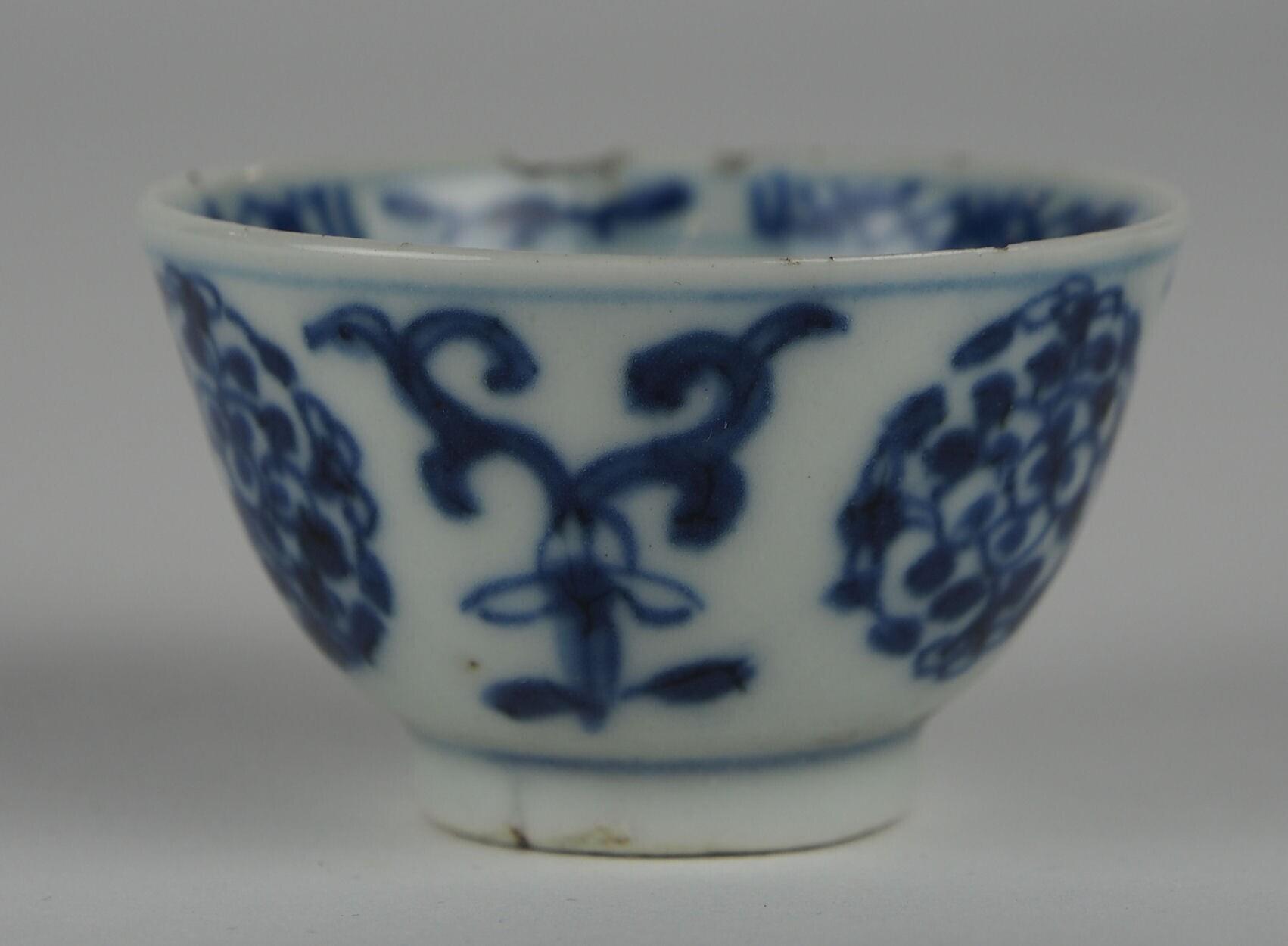 de kop heeft een omgekeerde klok vorm met een standring. op het plat staat een bloem afgebeeld. langs de binnenrand is een decoratieve cirkel zichtbaar. (Nederlands)