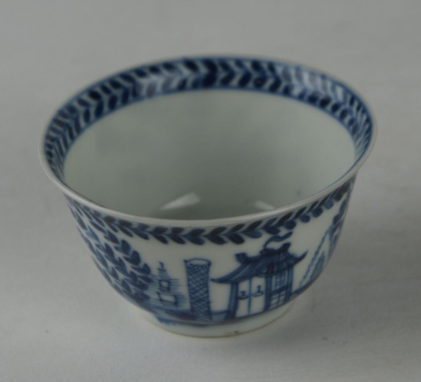 De schotels die bij deze kopen horen hebben een oplopende rand en een standring. De binnenzijde van de schotels heeft een decor van een bloeiende plant op een wolk, bladranken, een huisje met een vaandel op een dak of terras met 'prunus on cracked ice'-motief, en een paal en een driehoekige constructie waarop twee vogels, een zogenoemd 'cuckoo on the house'-decor. De buitenwand van de kommen heeft een vergelijkbaar, maar licht afwijkend decor. Langs de binnenrand van de schoteltjes en de buitenrand van de kommen lopen banden met bladranken. (Nederlands)