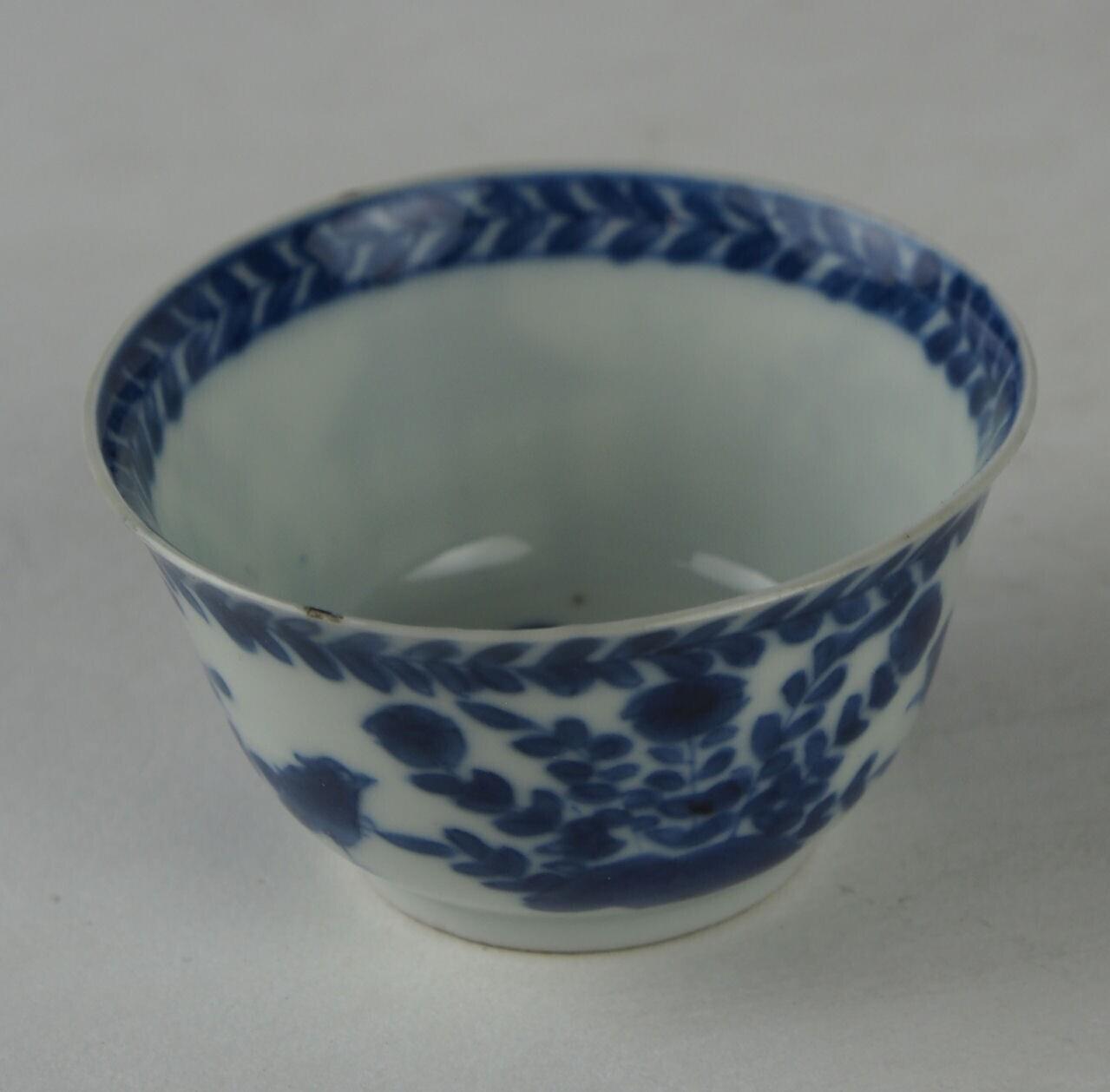 De schotels die bij deze kopen horen hebben een oplopende rand en een standring. De binnenzijde van de schotels heeft een decor van een bloeiende plant op een wolk, bladranken, een huisje met een vaandel op een dak of terras met 'prunus on cracked ice'-motief, en een paal en een driehoekige constructie waarop twee vogels, een zogenoemd 'cuckoo on the house'-decor. De buitenwand van de kommen heeft een vergelijkbaar, maar licht afwijkend decor. Langs de binnenrand van de schoteltjes en de buitenrand van de kommen lopen banden met bladranken. (Nederlands)