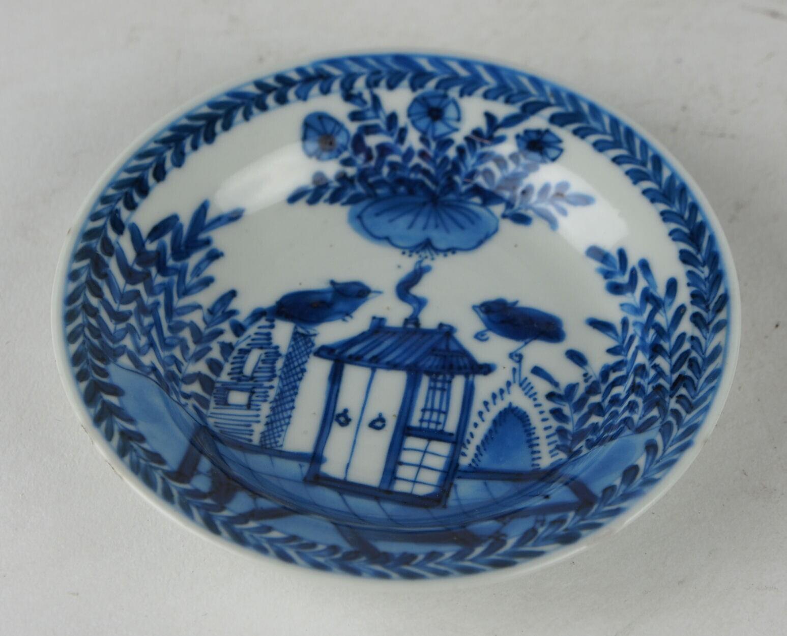 De schotels met oplopende rand hebben een standring. De binnenzijde van de schotels heeft een decor van een bloeiende plant op een wolk, bladranken, een huisje met een vaandel op een dak of terras met 'prunus on cracked ice'-motief, en een paal en een driehoekige constructie waarop twee vogels, een zogenoemd 'cuckoo on the house'-decor. De buitenwand van de kommen heeft een vergelijkbaar, maar licht afwijkend decor. Langs de binnenrand van de schoteltjes en de buitenrand van de kommen lopen banden met bladranken. (Nederlands)