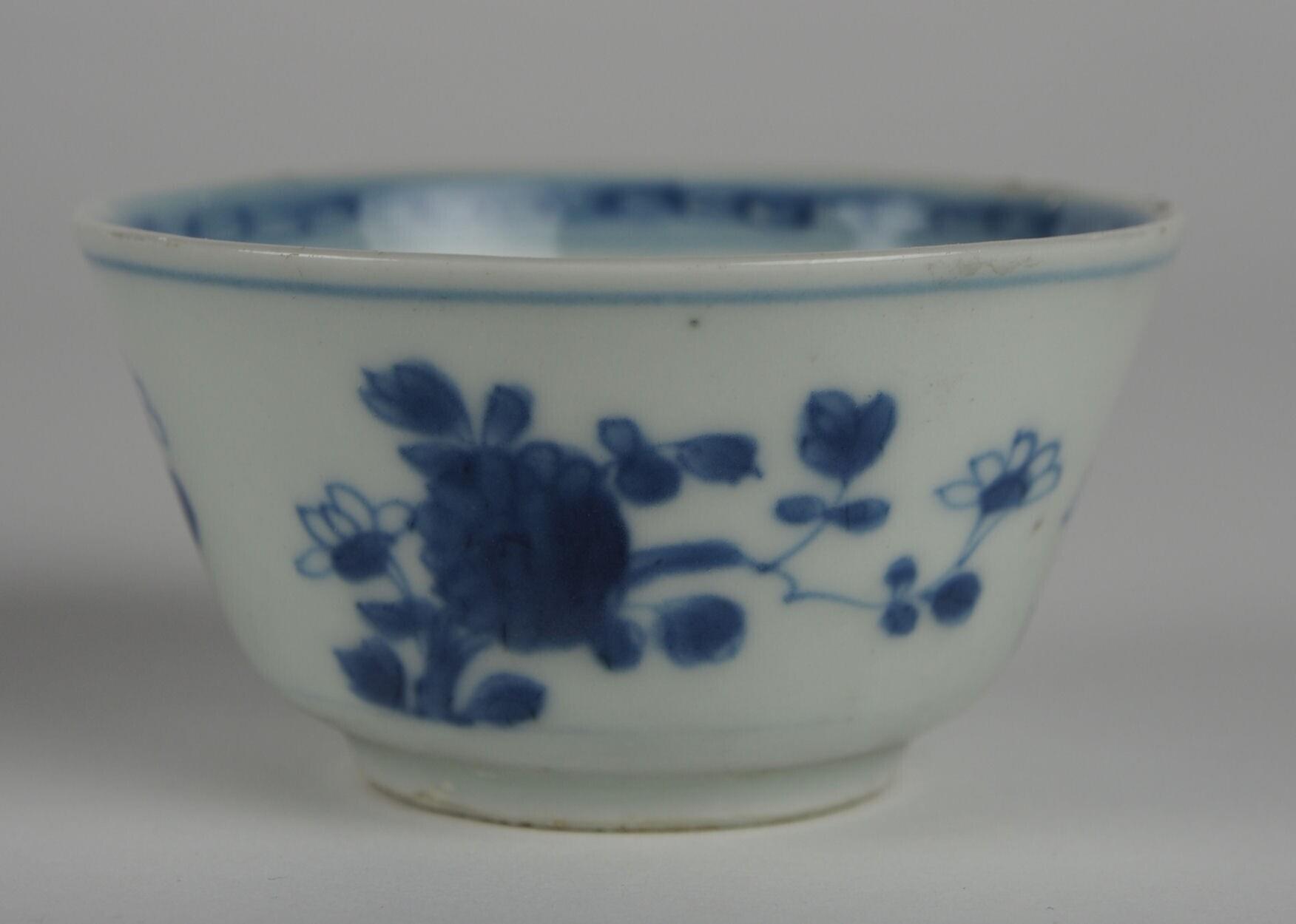 De kommen hebben een omgekeerd convex-conische bodem, een omgekeerd conische wand en een standring. Het plat heeft, binnen een enkele cirkel, een decor van een rivieroever met een rots, een bloeiende plant en twee eenden. Langs de binnenrand loopt een band met eenvoudig servetwerk. De buitenwand is gedecoreerd met bloeiende planten. Kleine randbeschadigingen. (Nederlands)