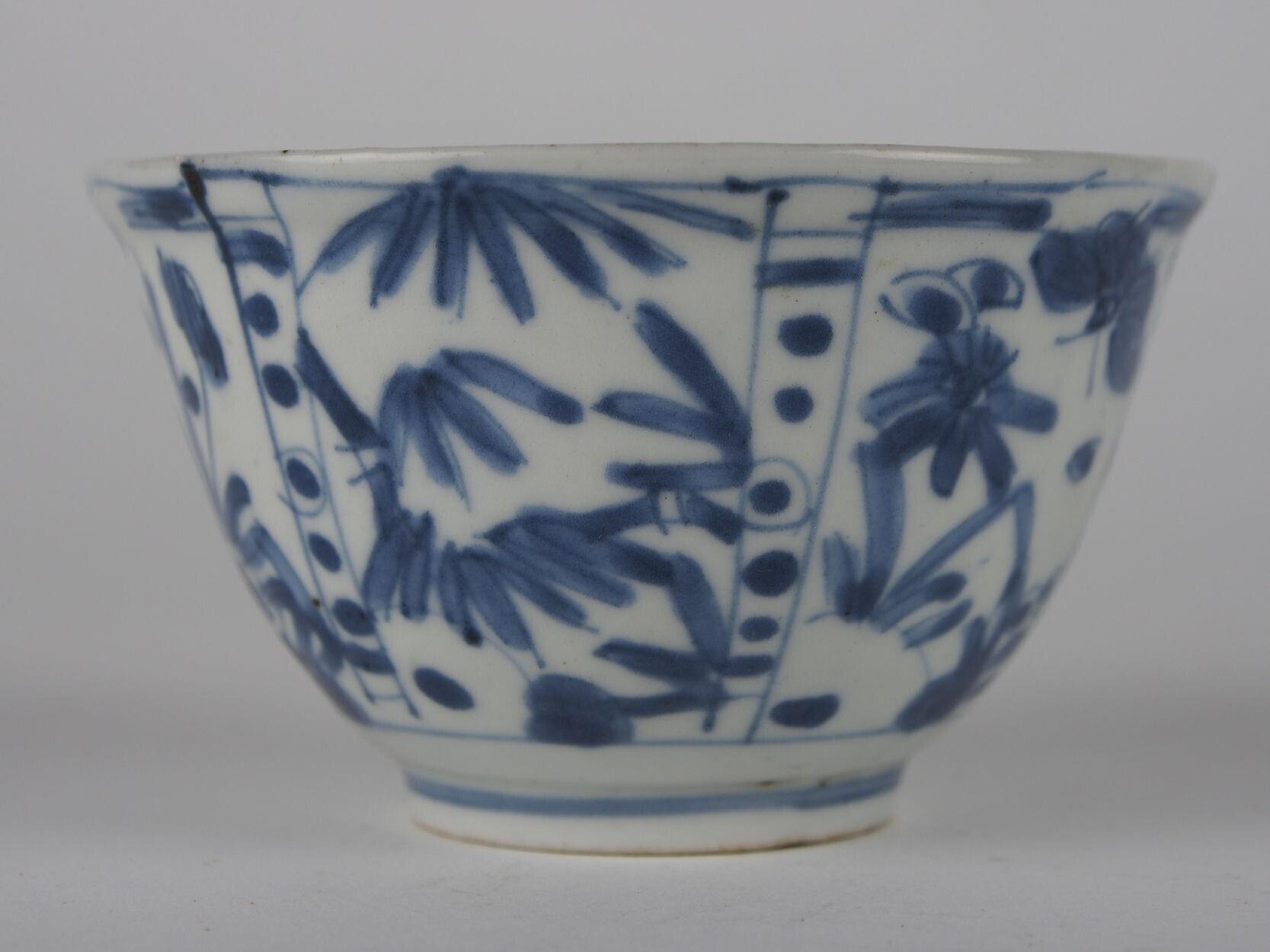 De kommen zijn omgekeerd klokvormig en hebben een standring. Het plat heeft, binnen een cirkel, een decor van een vogel. De binnenwand heeft zes brede kaders waarin afwisselend een tak en een bloem op steel. Tussen de kaders bevinden zich smalle vakken met vijf parels. De buitenwand heeft zes brede kaders waarin vlinders tussen blad- en floraalmotieven. Tussen de kaders bevinden zich smalle vakken met parels. Dit type kopjes wordt ook wel een 'kraaikop' genoemd. (Nederlands)