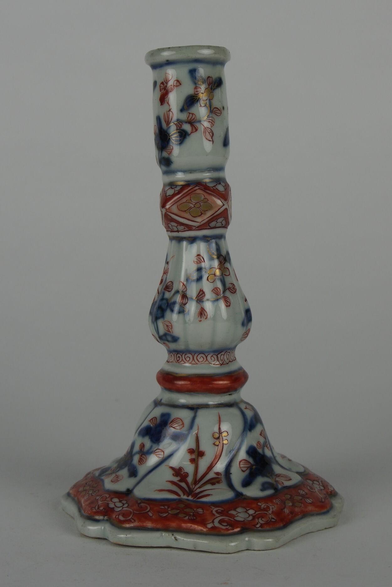 De drie kandelaars zijn voorzien van een klokvormige geschulpte voet beschilderd met panelen met diverse bloemen. Het baluster middengedeelte wordt aan de boven- en onderkant begrenst door een gefacetteerde knop en een ring. Hierboven is de kaarsenhouder. Het geheel is versierd met bloemen. (Nederlands)