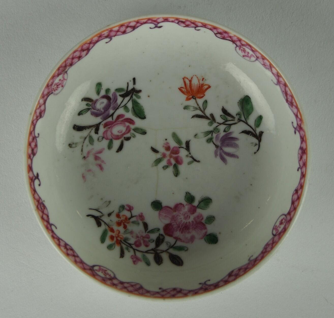 porselein, famille rose-techniek in Lowestoft-stijl (groen, roze, rood, paars, magenta), bovenglazuur (goud) (Nederlands)