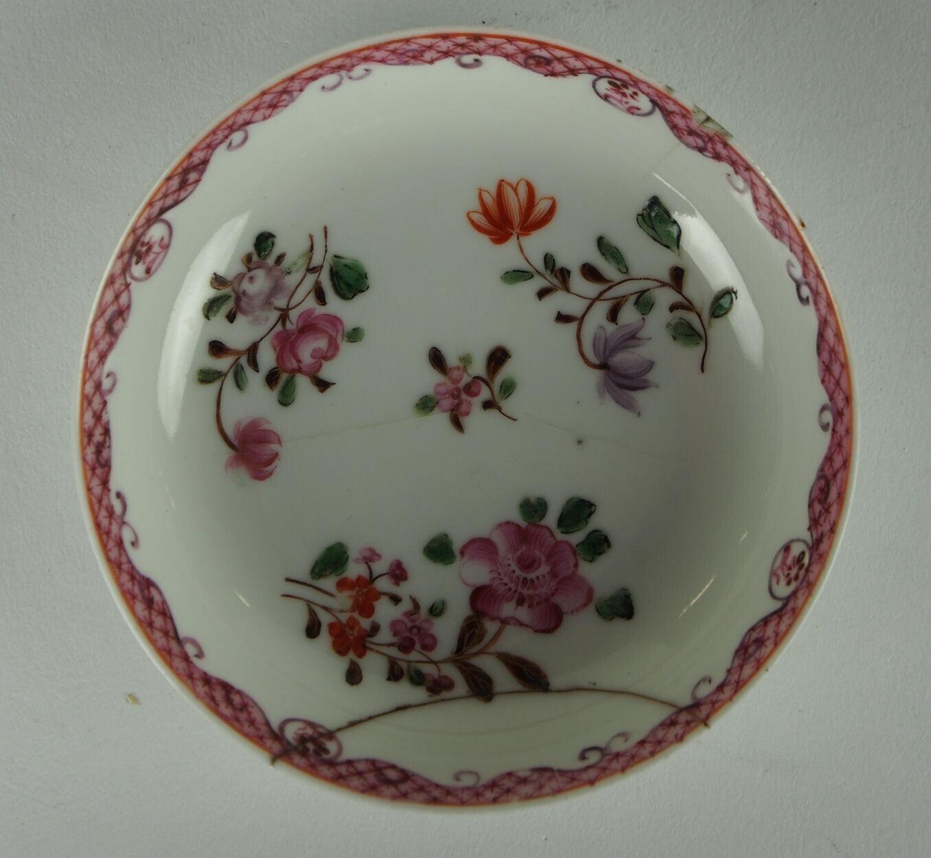 porselein, famille rose-techniek in Lowestoft-stijl (groen, roze, rood, paars, magenta), bovenglazuur (goud) (Nederlands)