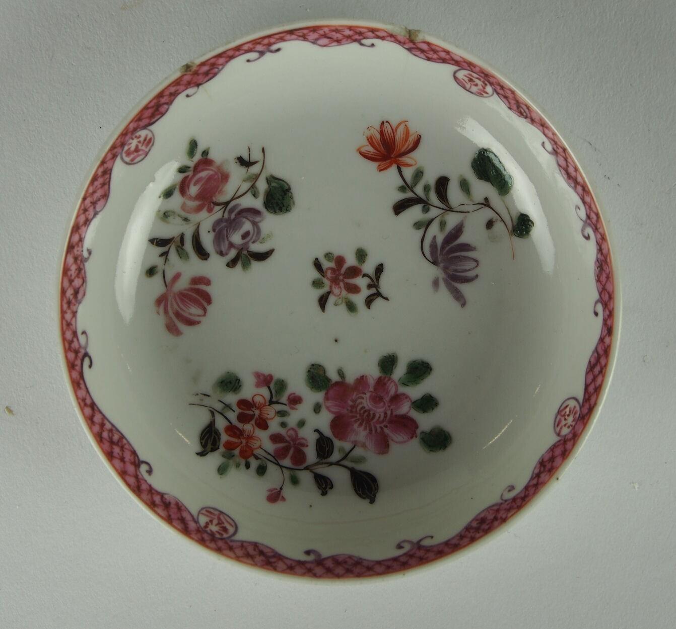 porselein ; famille rose-techniek in Lowestoft-stijl (groen, roze, rood, paars, magenta) ; bovenglazuur (goud) (Nederlands)