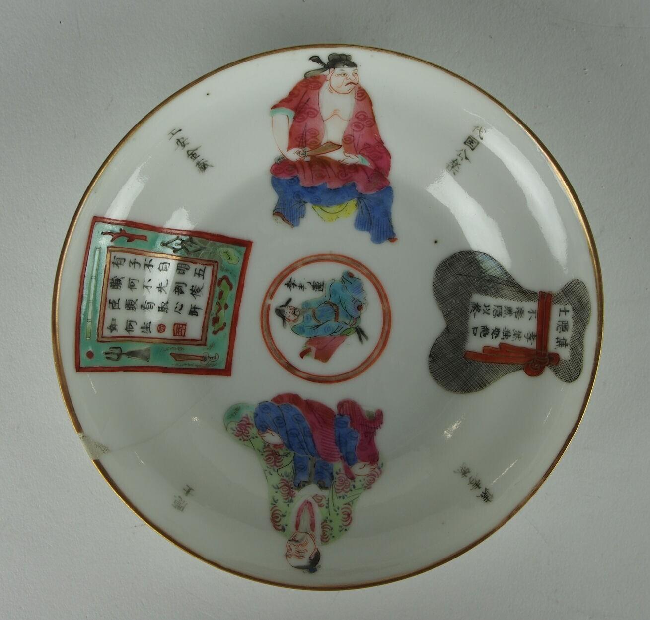 De schoteltjes hebben een standring en een brede, holle rand. Het plat heeft, binnen een dubbele cirkel, een decor van een Chinese tekst en de rustende wijsgeer Li Tai Poh met een rolkussen. Daaromheen bevindt zich een decor van een staande oosterse man met een dolk, een dichtgeknoopte zak met daarop een tekst, een zittende oosterse man, en een tekst in een rechthoekig kader. Tussen de decors staan Chinese karakters. (Nederlands)