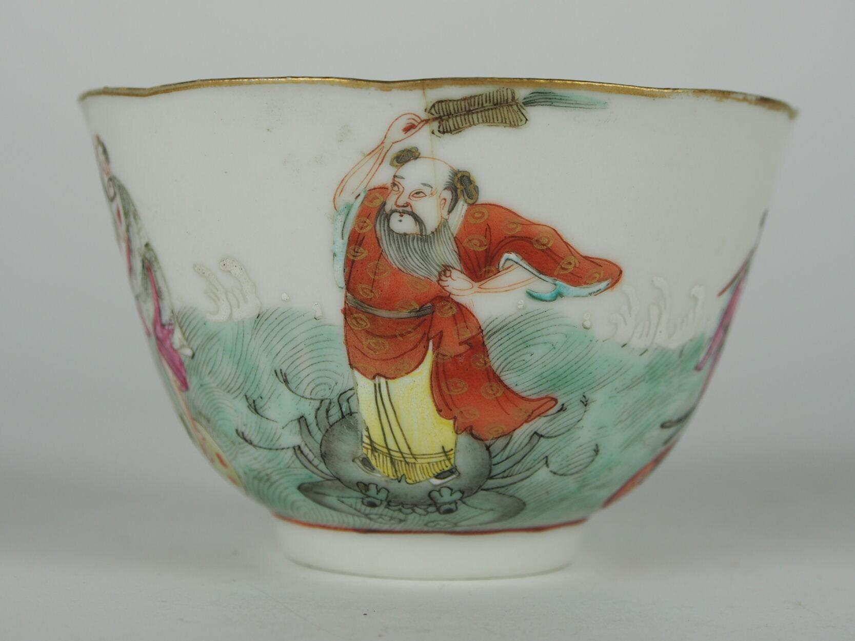 Het theekommetje is convex-conisch van vorm en heeft een standring en een geschulpte rand. De kom is gedecoreerd met een landschap waarin een staande man, een ruiter te paard, een oude man met een stok, en een man met een waaier, die op een krab staat. Het deksel is gewelfd en heeft een ring als knop. De kom is gedecoreerd met drie oosterse figuren in een landschap. (Nederlands)