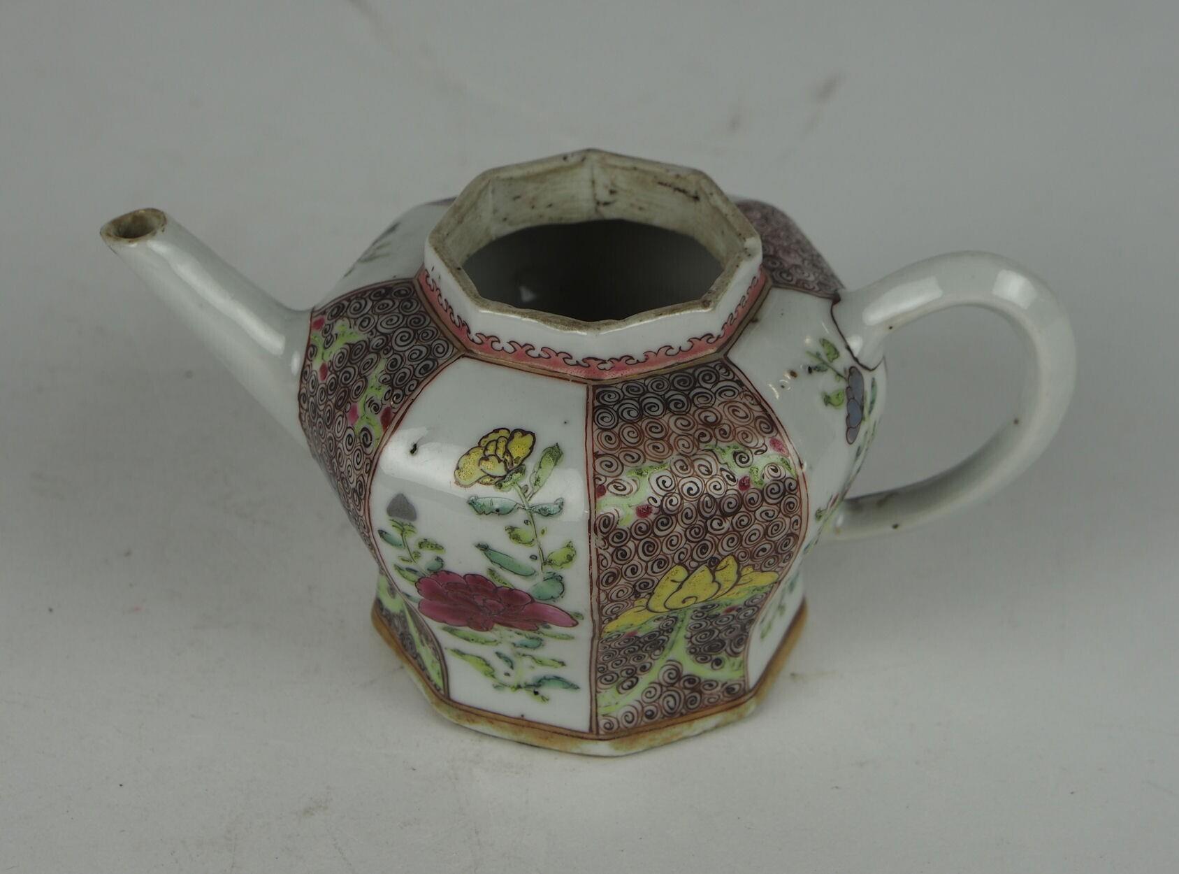 Het octagonale trekpotje is balustervormig en heeft een stand'ring', een korte rechte hals, een ovaal oor en een rechte tuit. Het octagonale deksel is wijd klokvormig en heeft een ?vormige knop. De buik heeft rechte kaders met afwisselend een bloemenrank, en een lotusbloem tegen een achtergrond van servetwerk. Op de hals en de dekselrand lopen smalle banden met een floraaldecor. Het deksel is versierd met twee bloemenranken. (Nederlands)