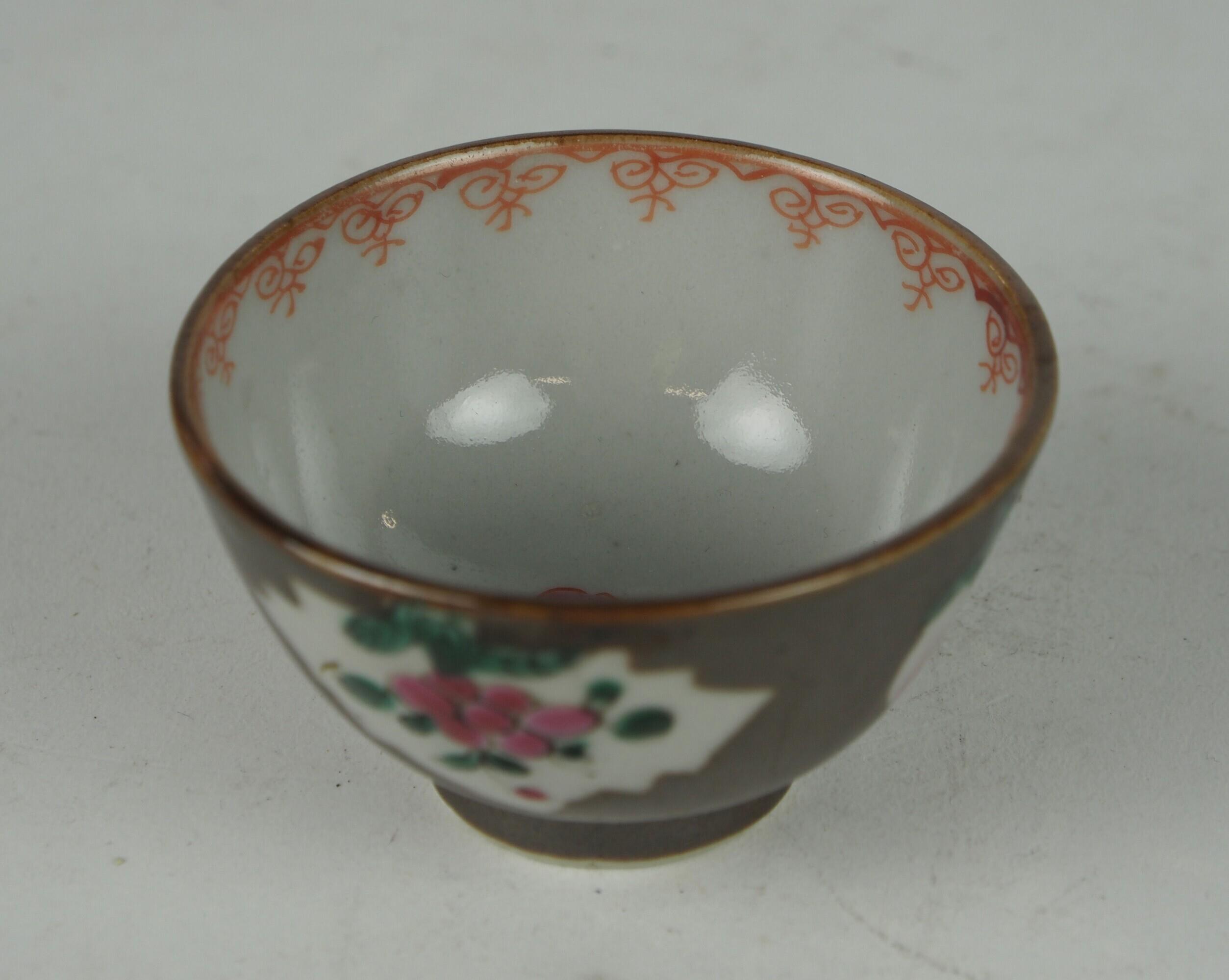 kop met capucijnerbruin fond. In blad- en vruchtvormige cartouches bloemtakjes in famille rose. (Nederlands)