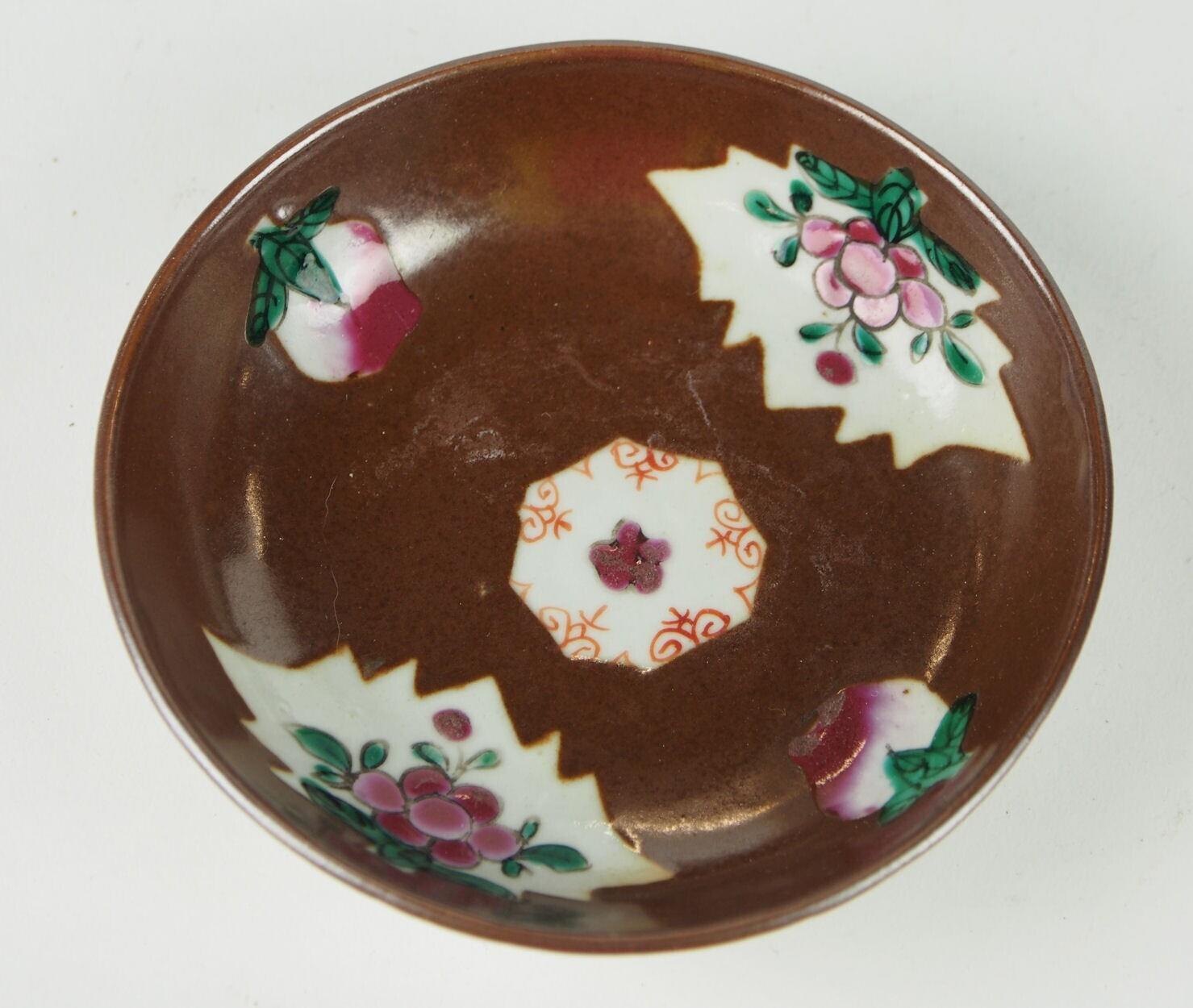 schotel met capucijnerbruin fond. In blad- en vruchtvormige cartouches bloemtakjes in famille rose. (Nederlands)