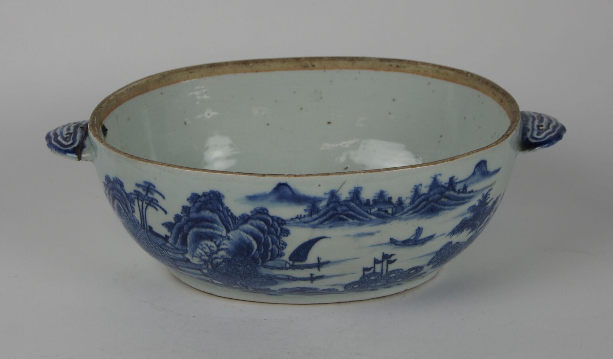 De ovale terrine is convex-conisch van vorm en heeft een standring en twee gewelfde grepen. Het ovale deksel is gewelfd en heeft een verdikte rand en een knop met pijnappeldecor. De terrine heeft twee decors van rivierlandschappen met bergen, rotsen, bomen, huizen, een pagode, bootjes en vaandels. De grepen zijn aan de bovenzijde gedecoreerd met gestileerde wolken. Het deksel heeft vier decors van bloemen met rankwerk. Op de dekselrand loopt een band met bloemvormig servetwerk. Een greep heeft een herstelde breuk met metalen pin aan binnenzijde terrine. Andere greep is een chip afgebroken. (Nederlands)