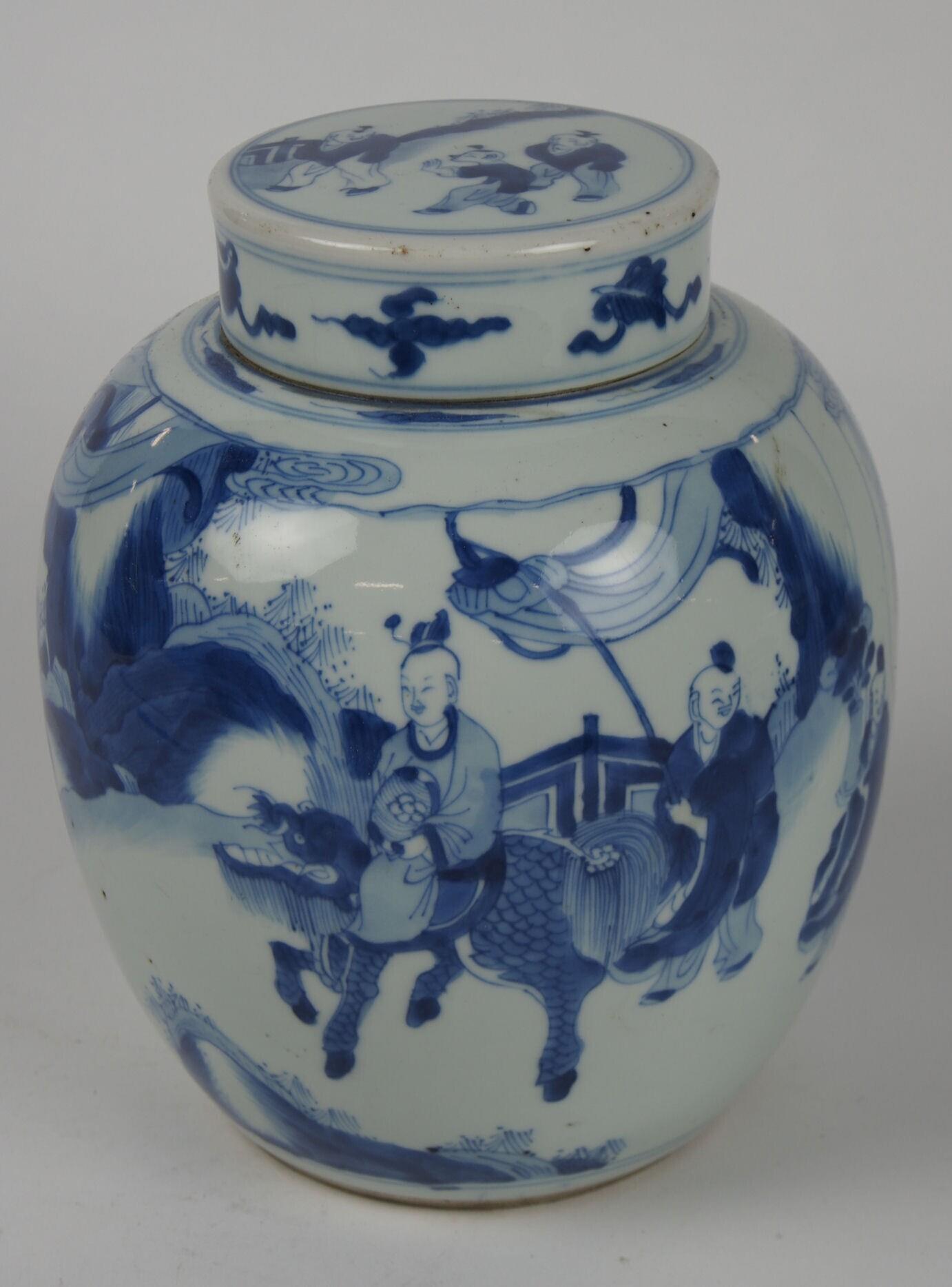 De potten zijn eivormig en hebben een standring en een plat cilindrisch deksel. De vaas heeft een doorlopend decor van een landschap met wolken, rotsen, planten, een hekje, een huis, een paard met een drakenkop, waarop een ruiter met een mandje eieren, en een gevolg van oosterse figuren met baldakijnen en vazen. Het deksel heeft op de wand een decor van boeddhistische symbolen, en op de bovenzijde drie zogenoemde zotjes. Deksel vastgelijmd. (Nederlands)