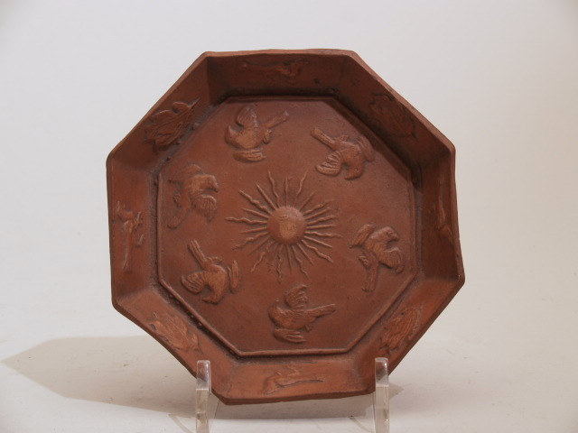 Achthoekige roodstenen, ongeglazuurde pattipan (onderzetschaaltje voor een theepot), centraal gedecoreerd met een stralende zon met daar omheen zes vliegende vogels. De wand is afwisselend gedecoreerd met een blad en een naar rechts lopende vogel. (Nederlands)