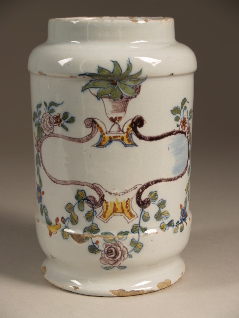 Apothekerspot met een cilindrische wand en een korte recht opstaande hals. De pot is polychroom gedcoreerd met een leegg...n cartouche en florale motieven.||Delft||De Drie Klokken, plateelbakkerij (1670-1841)||Keramiekmuseum Princessehof NO 05760