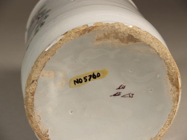 Apothekerspot met een cilindrische wand en een korte recht opstaande hals. De pot is polychroom gedcoreerd met een leegg...n cartouche en florale motieven.||Delft||De Drie Klokken, plateelbakkerij (1670-1841)||Keramiekmuseum Princessehof NO 05760 |