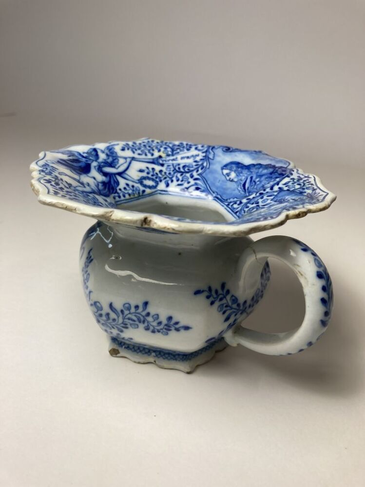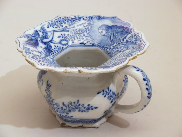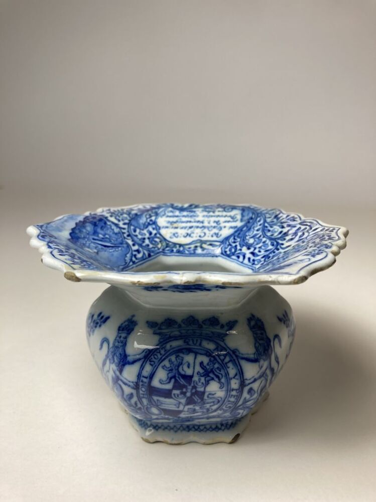 Kwispedoor met blauw-wit oranjedecor. Op de hals gedecoreerd met het portret van Willem IV in een cartouche en een engel met een hoorn waar de tekst: 'vivat oranje' uit komt, de kwispedoor is verder beschilderd met florale motieven. (Nederlands)