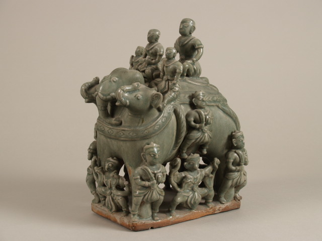 Driekoppige olifant met 4 garuda-achtige figuren tussen de poten, die slangen vasthouden. Op de 4 hoeken beschermende wachters met bijl en schild in de hand. Ook 2 wachters aan de zijvlank van de olifant. Op de olifant zitten 4 berijders. Het geheel staat op een evengroot rechthoekig voetstuk, deels oranje gebrand. Het geheel is bedekt met celadon glazuur met onregelmatige diktes. (Nederlands)