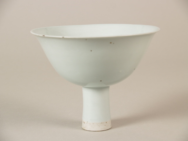 Wit geglazuurde stemcup. Het wit neigt naar het blauw-grijs en vertoont vele oneffenheden. De onderrand aan de voet is ongeglazuurd en binnen in hol aan buiten- en binnenzijde. De koperen foudraal is met zilverbeslag versierd. (Ingekorte beschrijving). (Nederlands)