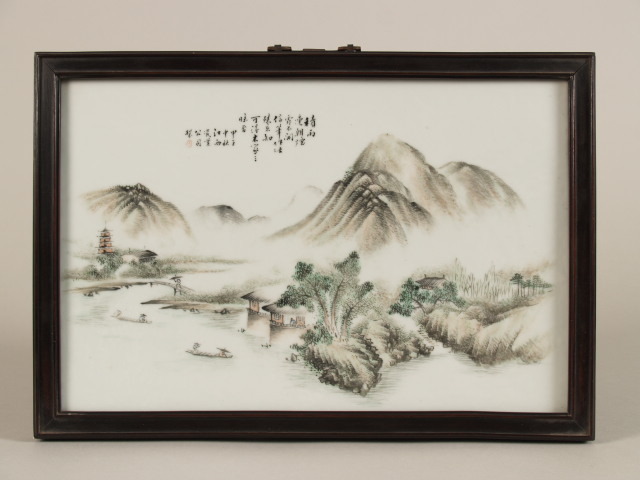 In polychroom beschilderd tableau in houten lijst. Voorstelling is een landschap met inscriptie die als volgt is te vert... Jiangxi Porcelain Company in Mid-Autumn, 1924.||China||Jiangxi Porcelain Company||Keramiekmuseum Princessehof OKS 1991-007 |