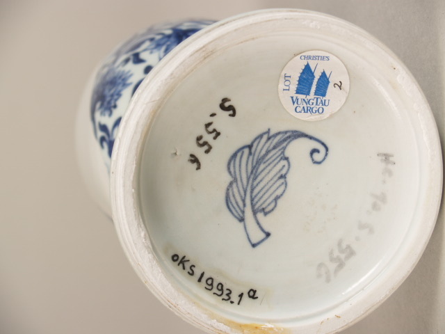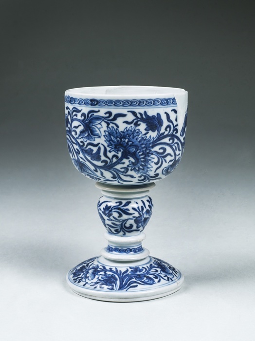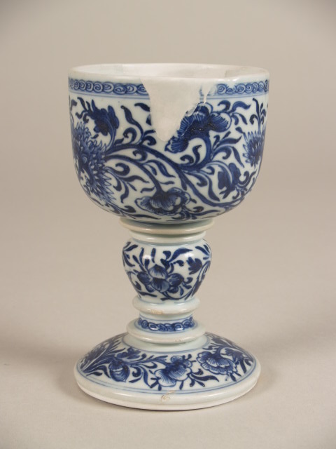 Bokaal of stemcup van porselein op spreidende voet en steel met nodus, beschilderd in onderglazuur blauw. De kop is versierd met bloemranken (prunus). De nodus en voet zijn beide beschilderd met een band met bloemranken. Op de rand en de steel een decoratieve band. Gemerkt op de onderzijde met een van de kostbaarheden (acanthusblad). Blauwwit, Vung Tau Cargo. (Nederlands)